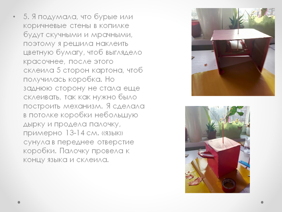 5. Я подумала, что бурые или коричневые стены в копилке будут скучными и мрачными, поэтому я решила наклеить цветную бумагу, чтоб выглядело красочнее, после этого склеила 5 сторон картона, чтоб получилась коробка. Но заднюю сторону не стала еще склеивать, так как нужно было построить механизм. Я сделала в потолке коробки небольшую дырку и продела палочку, примерно 13-14 см. «язык» сунула в переднее отверстие коробки. Палочку провела к концу языка и склеила.