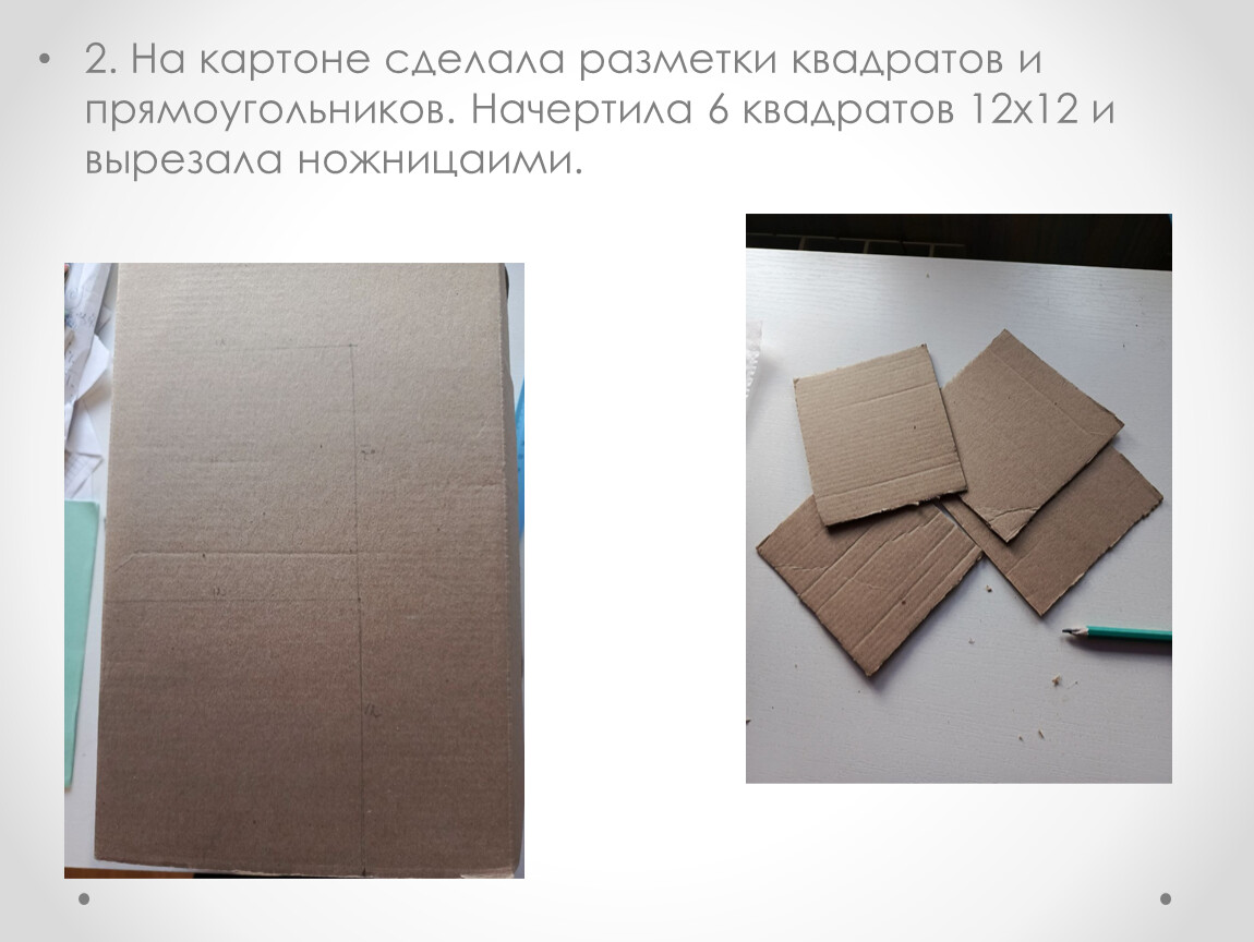 2. На картоне сделала разметки квадратов и прямоугольников. Начертила 6 квадратов 12х12 и вырезала ножницаими.