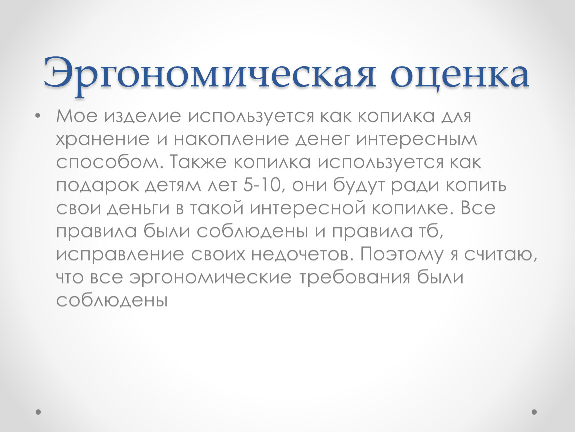 Мое изделие используется как копилка для хранение и накопление денег интересным способом. Также копилка используется как подарок детям лет 5-10, они будут ради копить свои деньги в такой интересной копилке. Все правила были соблюдены и правила тб, исправление своих недочетов. Поэтому я считаю, что все эргономические требования были соблюдены