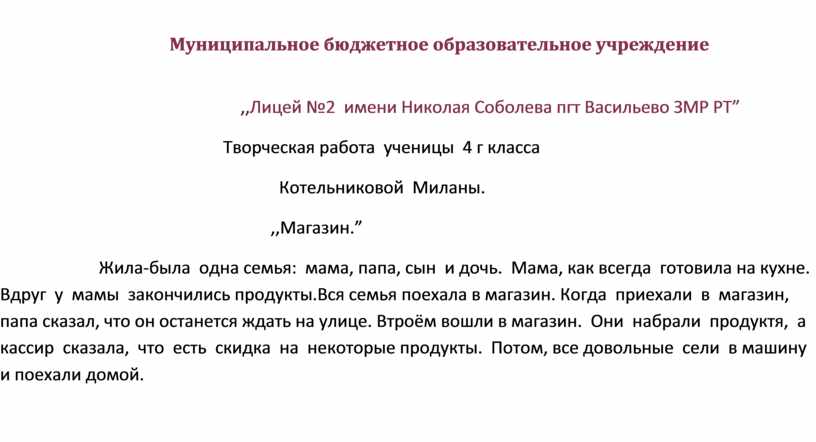 Жила-была одна семья: мама, папа, сын и дочь. Мама, как всегда готовила на кухне. Вдруг у мамы закончились продукты.Вся семья поехала в магазин. Когда приехали в магазин, папа сказал, что он останется ждать на улице. Втроём вошли в магазин. Они набрали продуктя, а кассир сказала, что есть скидка на некоторые продукты. Потом, все довольные сели в машину и поехали домой.