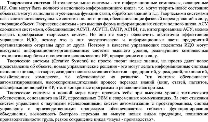 Творческая система. Интеллектуальные системы - это информационные комплексы, оснащенные ИИ. Они могут быть полного и неполного информационного цикла, т.е. могут творить новое состояние объекта, а могут выполнять и усеченные функции связи, обработки знаний и т.д. Творческими системами называются интеллектуальные системы полного цикла, обеспечивающие фазовый переход знаний в силу, творящие объект. Творческие системы - это высшая форма информационных систем полного цикла. АСУ сложными системами, объединяющие АСУП, АСУТП, САПР, АСНИ, т.е. интегрированные АСУ, можно назвать прообразами творческих систем. Но они не могут обеспечить достаточно эффективное управление ИДО, потому что в них энергетические и информационные части предприятий организационно оторваны друг от друга. Поэтому в качестве управляющих подсистем ИДО могут выступать информационно-организованные системы высшего уровня, реализующие комплексные технологии выработки и конечного использования ИР, превращение его в силу.