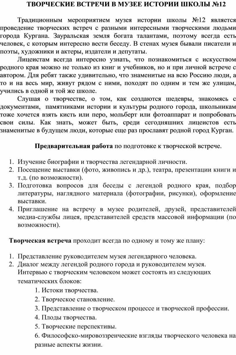 ТВОРЧЕСКИЕ ВСТРЕЧИ В МУЗЕЕ ИСТОРИИ ШКОЛЫ №12