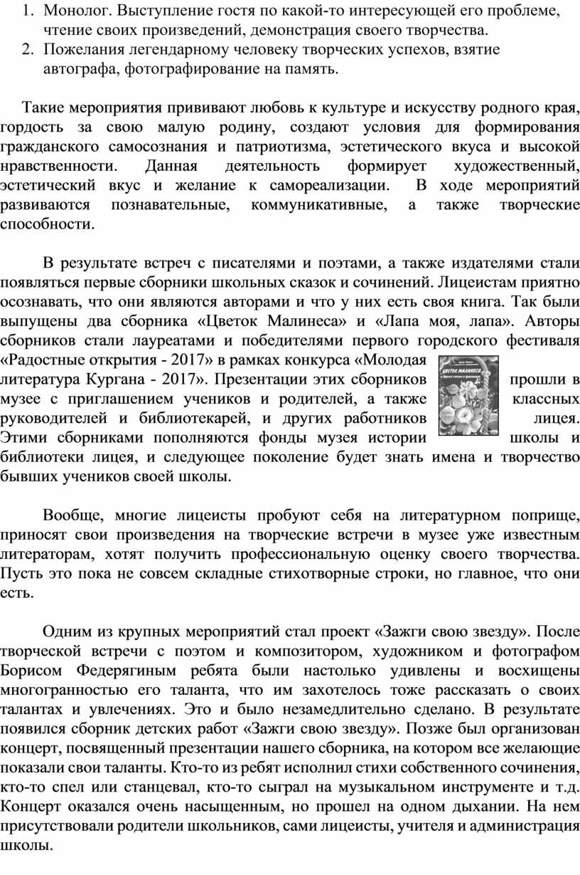 Одним из крупных мероприятий стал проект «Зажги свою звезду». После творческой встречи с поэтом и композитором, художником и фотографом Борисом Федерягиным ребята были настолько удивлены и восхищены многогранностью его таланта, что им захотелось тоже рассказать о своих талантах и увлечениях. Это и было незамедлительно сделано. В результате появился сборник детских работ «Зажги свою звезду». Позже был организован концерт, посвященный презентации нашего сборника, на котором все желающие показали свои таланты. Кто-то из ребят исполнил стихи собственного сочинения, кто-то спел или станцевал, кто-то сыграл на музыкальном инструменте и т.д. Концерт оказался очень насыщенным, но прошел на одном дыхании. На нем присутствовали родители школьников, сами лицеисты, учителя и администрация школы.