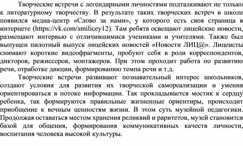 Творческие встречи развивают познавательный интерес школьников, создают условия для развития их творческой самореализации и умения ориентироваться в потоке информации. Так прокладывается мостик к сердцу ребенка, так формируются правильные жизненные ориентиры, происходит приобщение к вечным ценностям жизни. В этом суть музейной педагогики. Продолжая оставаться местом хранения реликвий и раритетов, музей становится базой для общения, формирования коммуникативных качеств личности, воспитания человека высокой культуры.