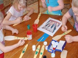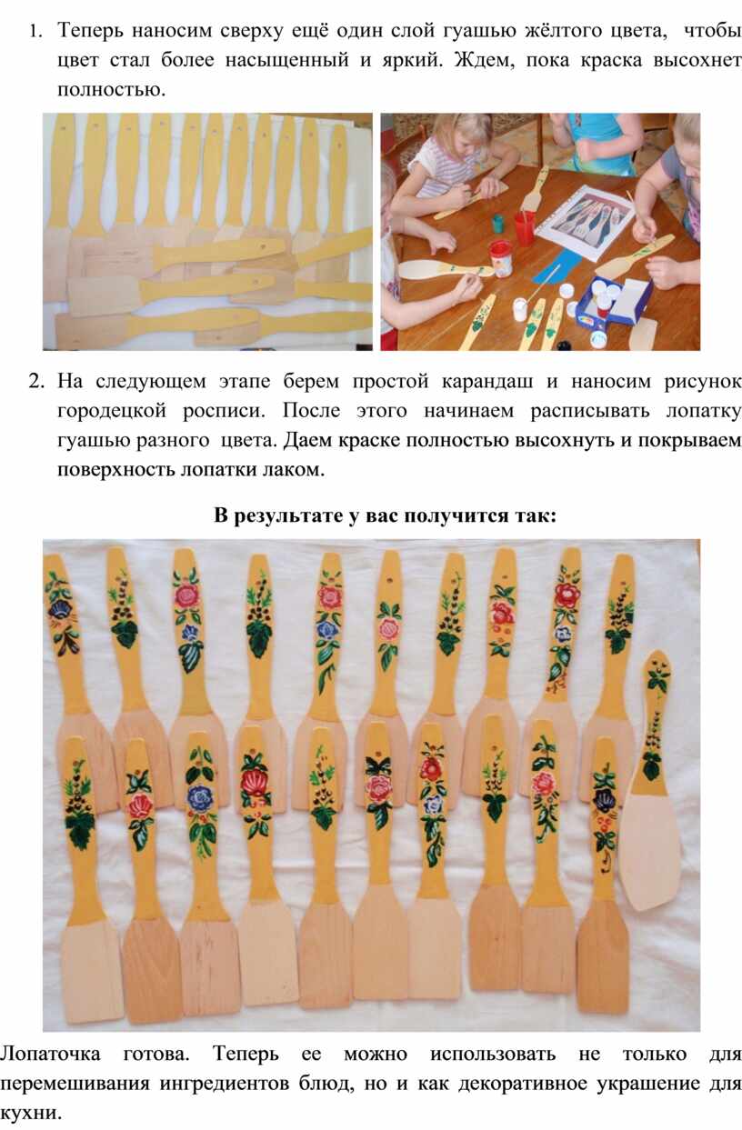 Понадобятся: деревянная лопаточка, гуашь, клей ПВА, простой карандаш, кисточка № 1 и № 3, лак по дереву.