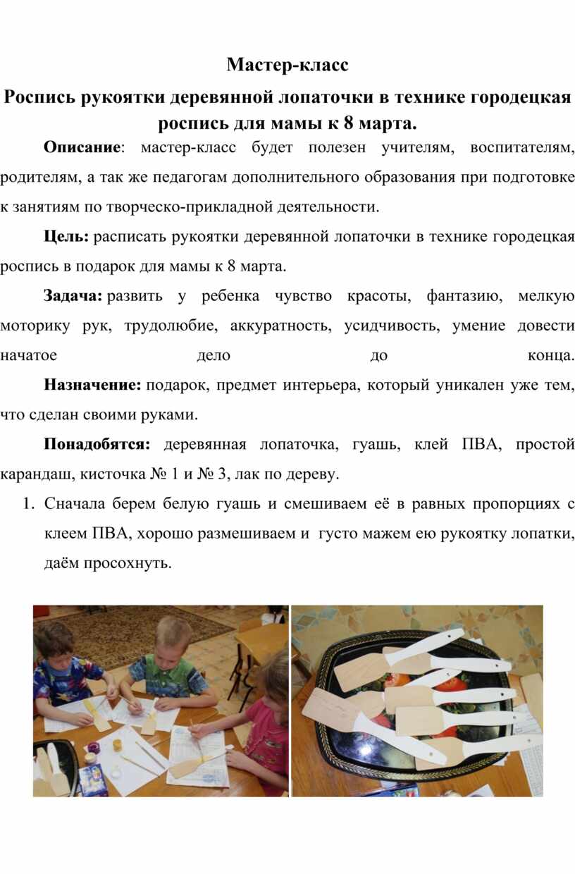 Цель: расписать рукоятки деревянной лопаточки в технике городецкая роспись в подарок для мамы к 8 марта.