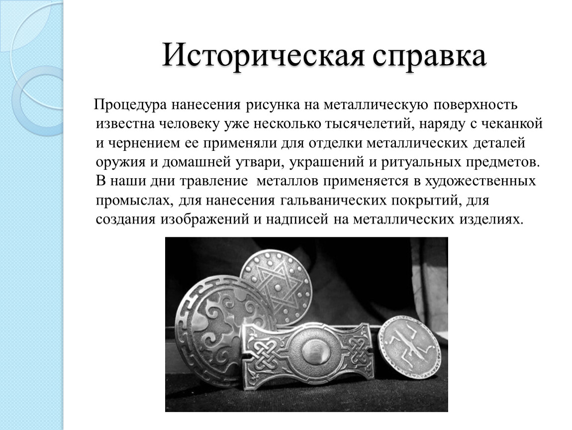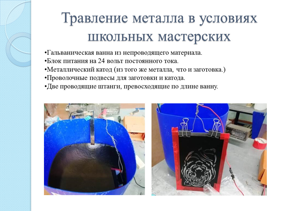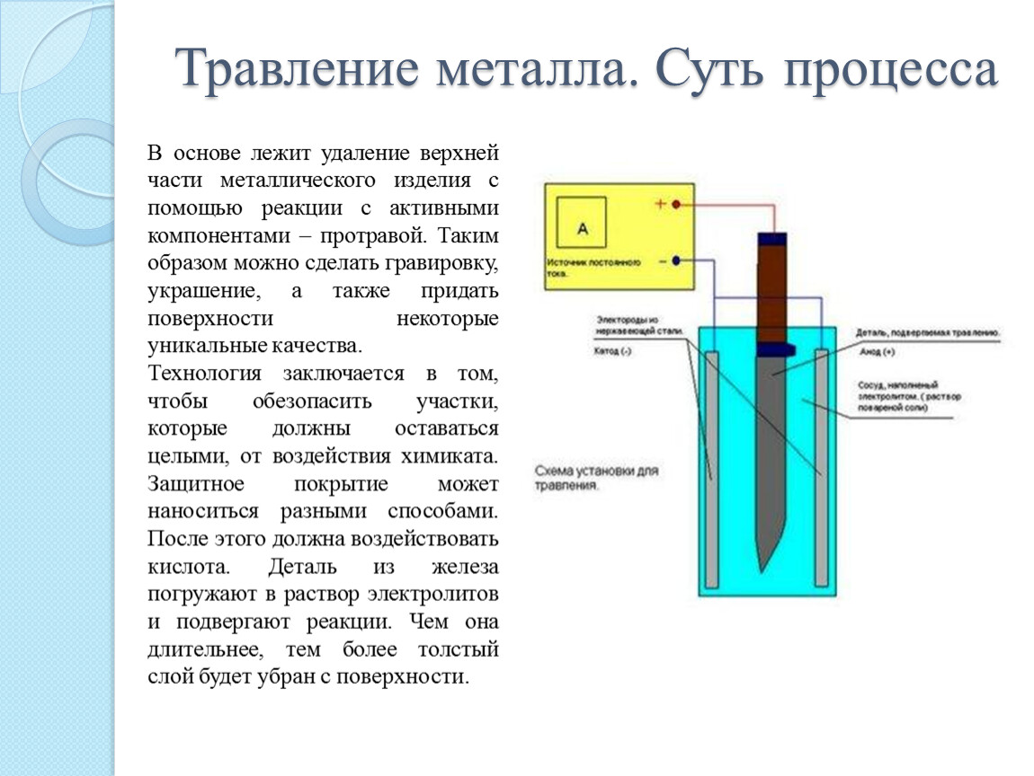 В основе лежит удаление верхней части металлического изделия с помощью реакции с активными компонентами – протравой. Таким образом можно сделать гравировку, украшение, а также придать поверхности некоторые уникальные качества.