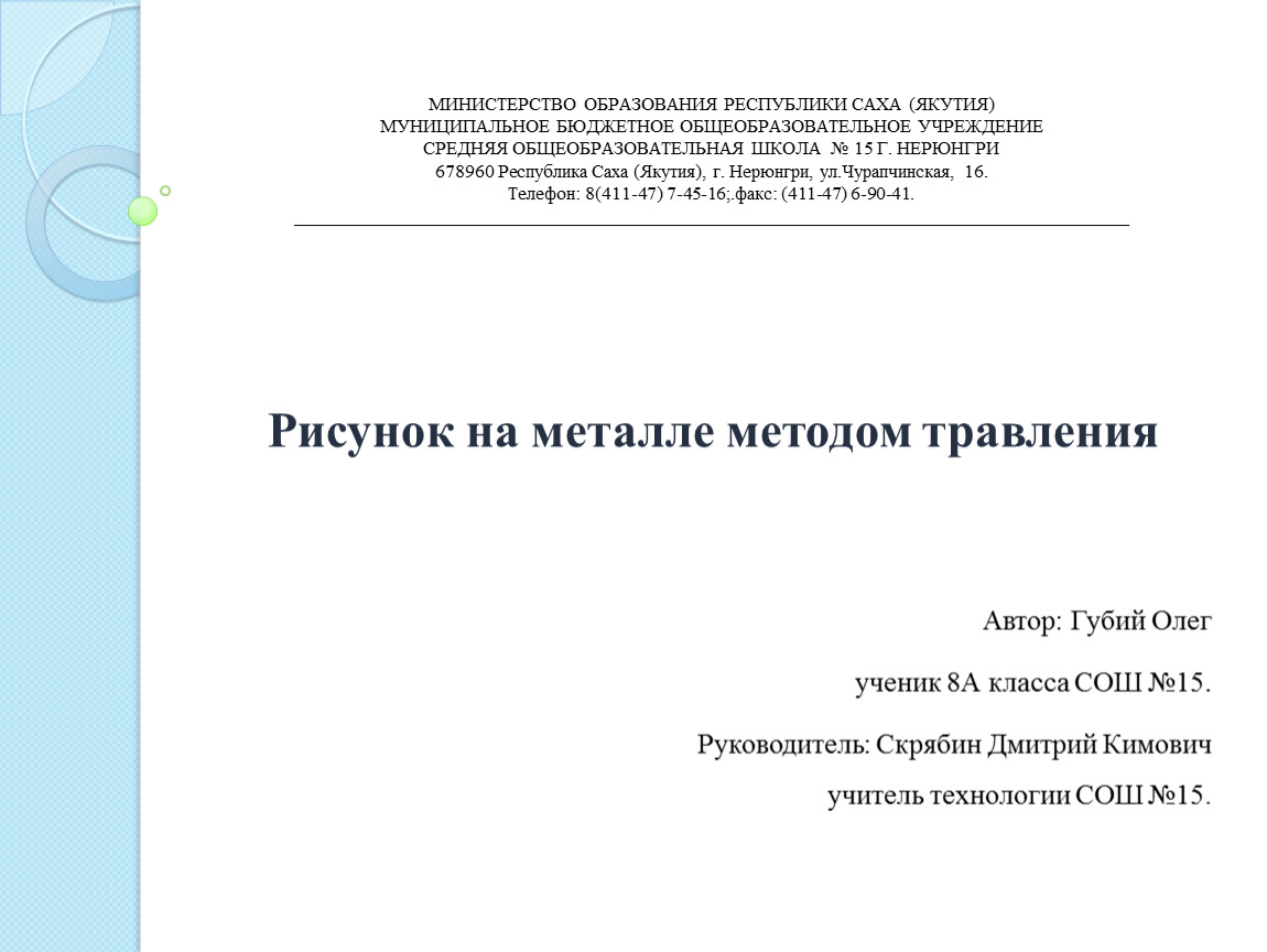МИНИСТЕРСТВО ОБРАЗОВАНИЯ РЕСПУБЛИКИ САХА (ЯКУТИЯ)МУНИЦИПАЛЬНОЕ БЮДЖЕТНОЕ ОБЩЕОБРАЗОВАТЕЛЬНОЕ УЧРЕЖДЕНИЕСРЕДНЯЯ ОБЩЕОБРАЗОВАТЕЛЬНАЯ ШКОЛА № 15 Г. НЕРЮНГРИ678960 Республика Саха (Якутия), г. Нерюнгри, ул.Чурапчинская, 16.Телефон: 8(411-47) 7-45-16;.факс: (411-47) 6-90-41. __________________________________________________________________________________________