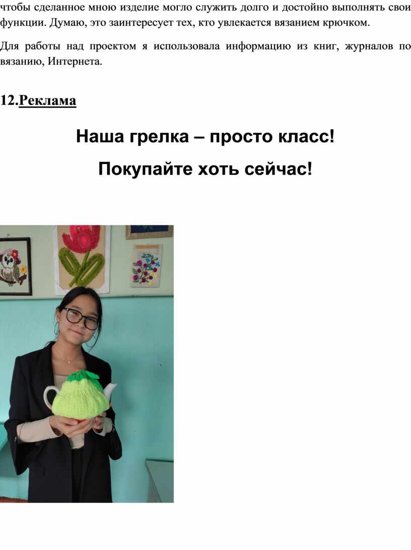 Разрабатывая проект, изготавливая по нему изделие, я совершенствовала свои возможности в области проектной деятельности. Надеюсь, что реализация этого проекта помогла мне разработать и выполнить оригинальное изделие. Я хочу, чтобы сделанное мною изделие могло служить долго и достойно выполнять свои функции. Думаю, это заинтересует тех, кто увлекается вязанием крючком.