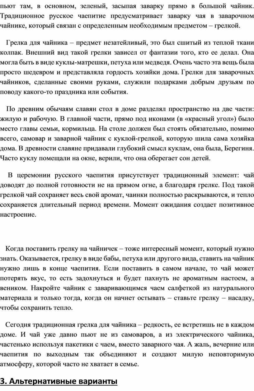 Грелка для чайника – предмет незатейливый, это был сшитый из теплой ткани колпак. Внешний вид такой грелки зависел от фантазии того, кто ее делал. Она могла быть в виде куклы-матрешки, петуха или медведя. Очень часто эта вещь была просто шедевром и представляла гордость хозяйки дома. Грелки для заварочных чайников, сделанные своими руками, служили подарками добрым друзьям по поводу какого-то праздника или события.
