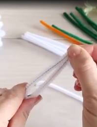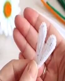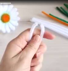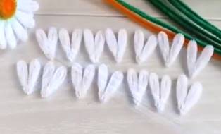 1. Первым этапом делаем для ромашки лепестки. Для этого нарезанную по десять сантиметров проволоку дети сгибают пополам, совмещая ровно концы
