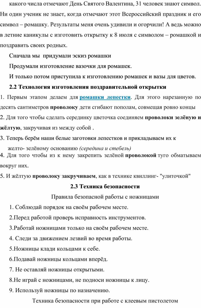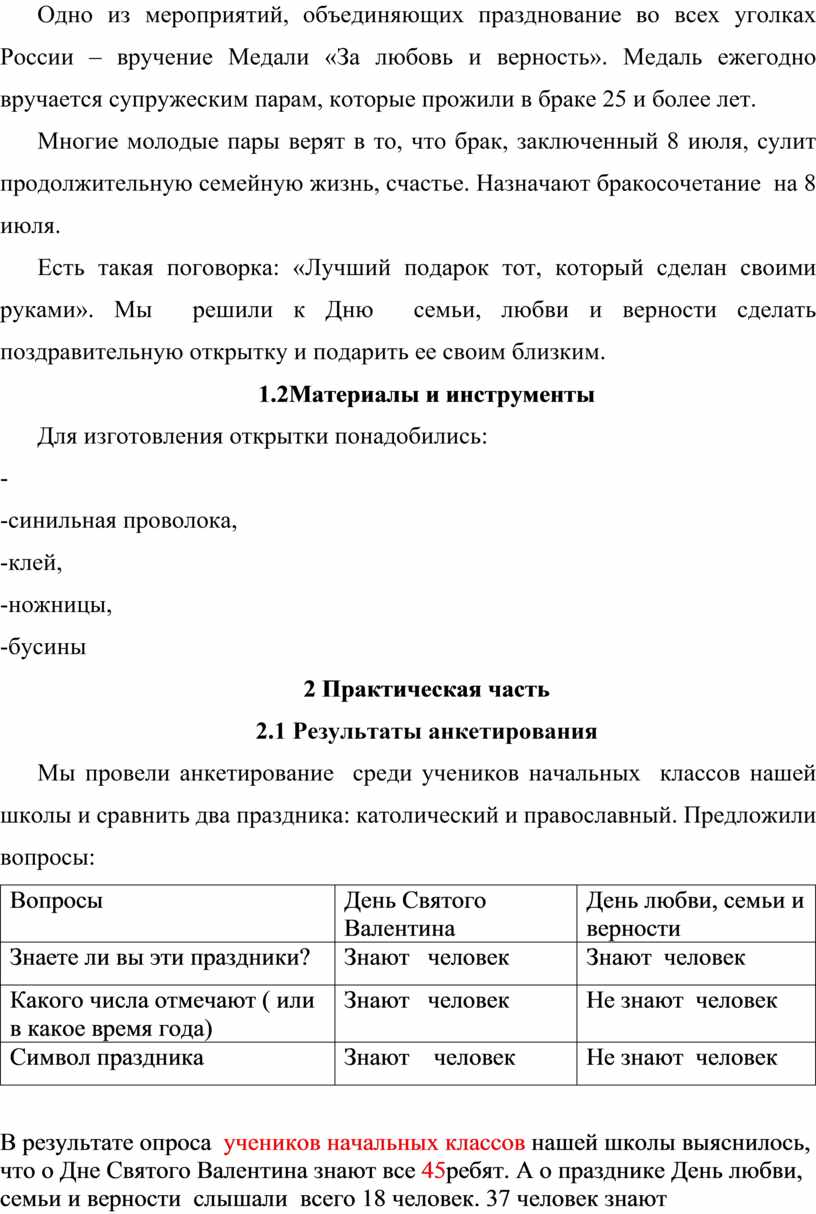 В результате опроса учеников начальных классов нашей школы выяснилось, что о Дне Святого Валентина знают все 45ребят. А о празднике День любви, семьи и верности слышали всего 18 человек. 37 человек знают какого числа отмечают День Святого Валентина, 31 человек знают символ. Ни один ученик не знает, когда отмечают этот Всероссийский праздник и его символ – ромашку. Результаты меня очень удивили и огорчили! А ведь можно в летние каникулы с изготовить открытку к 8 июля с символом – ромашкой и поздравить своих родных.