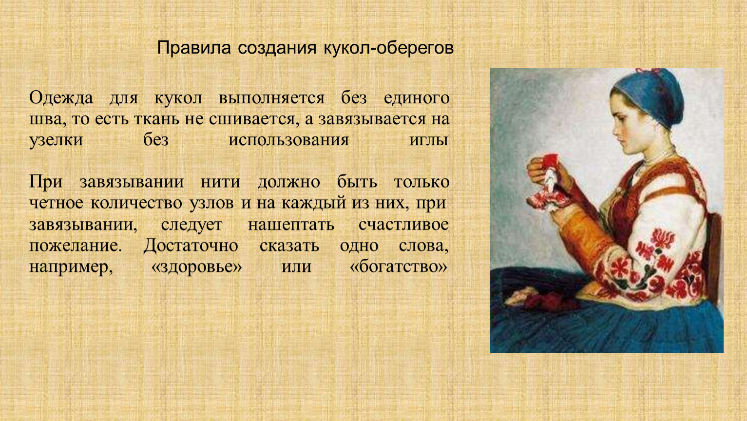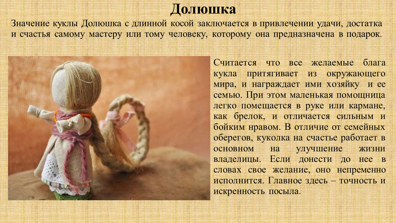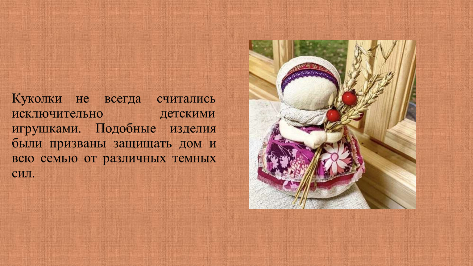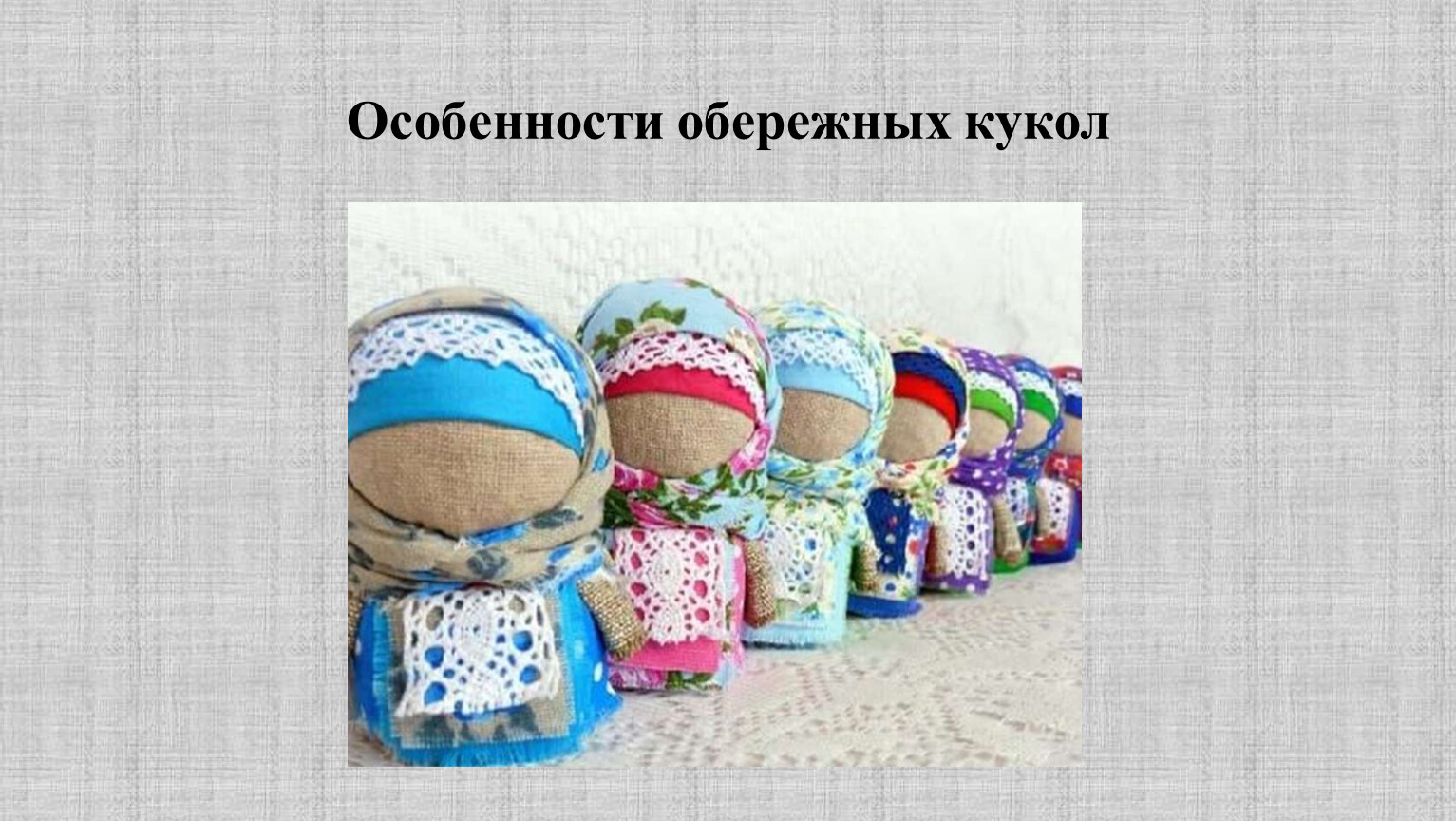 - Изучение истории возникновения и символики русских народных кукол-оберегов.