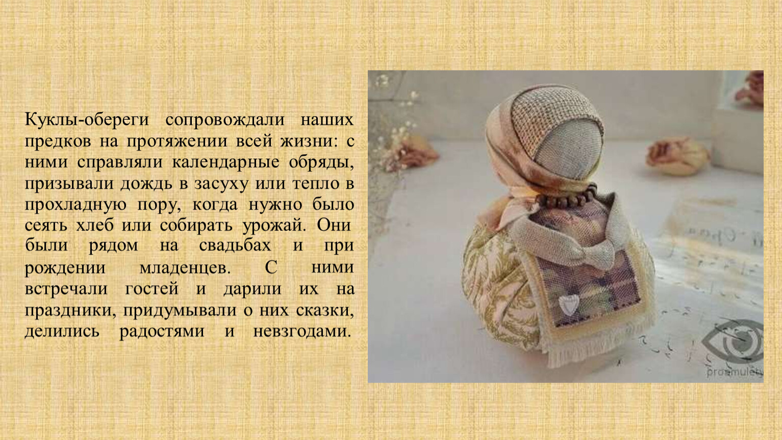 Куклы-обереги сопровождали наших предков на протяжении всей жизни: с ними справляли календарные обряды, призывали дождь в засуху или тепло в прохладную пору, когда нужно было сеять хлеб или собирать урожай. Они