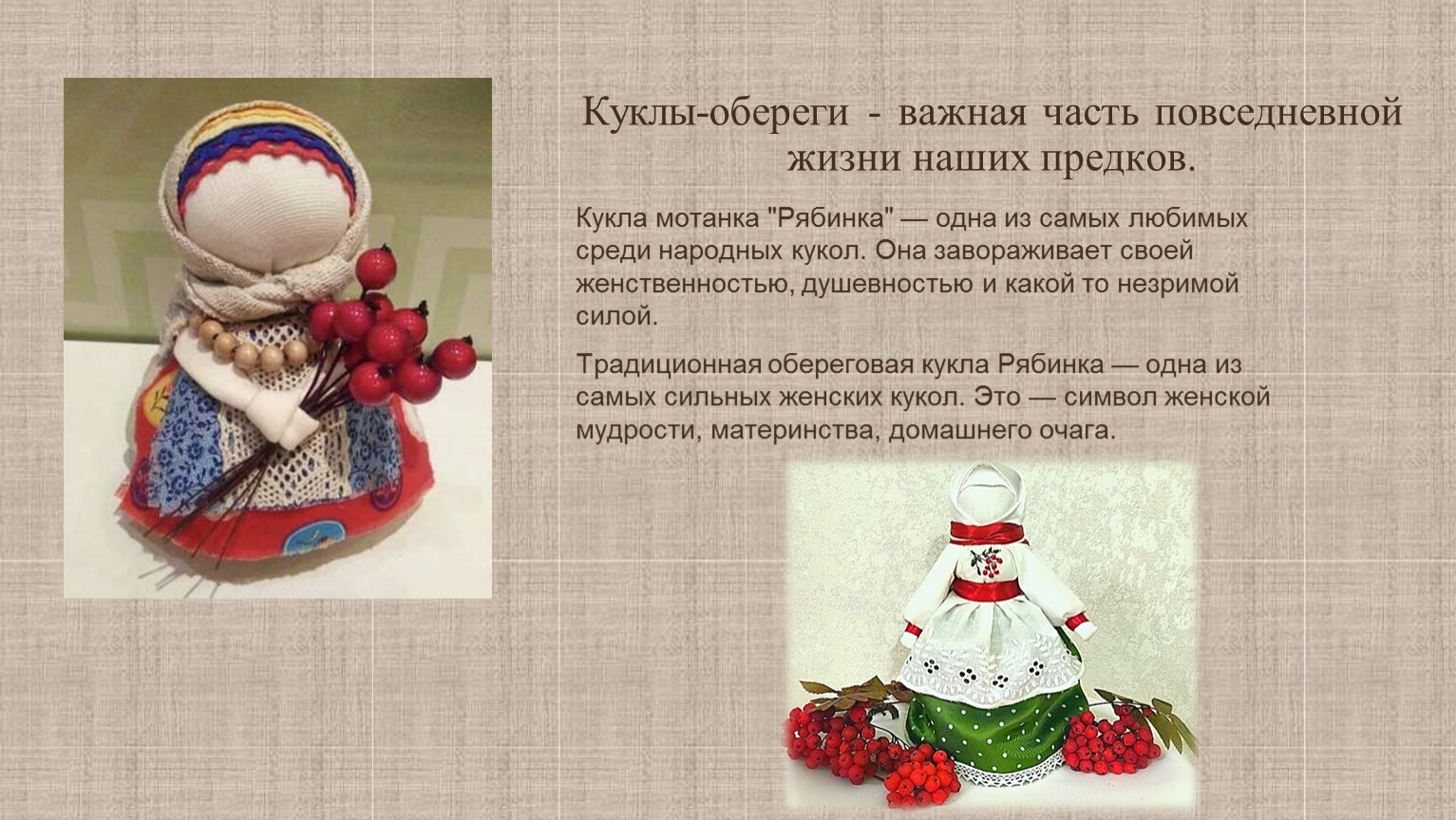 Традиционная обереговая кукла Рябинка — одна из самых сильных женских кукол. Это — символ женской мудрости, материнства, домашнего очага.