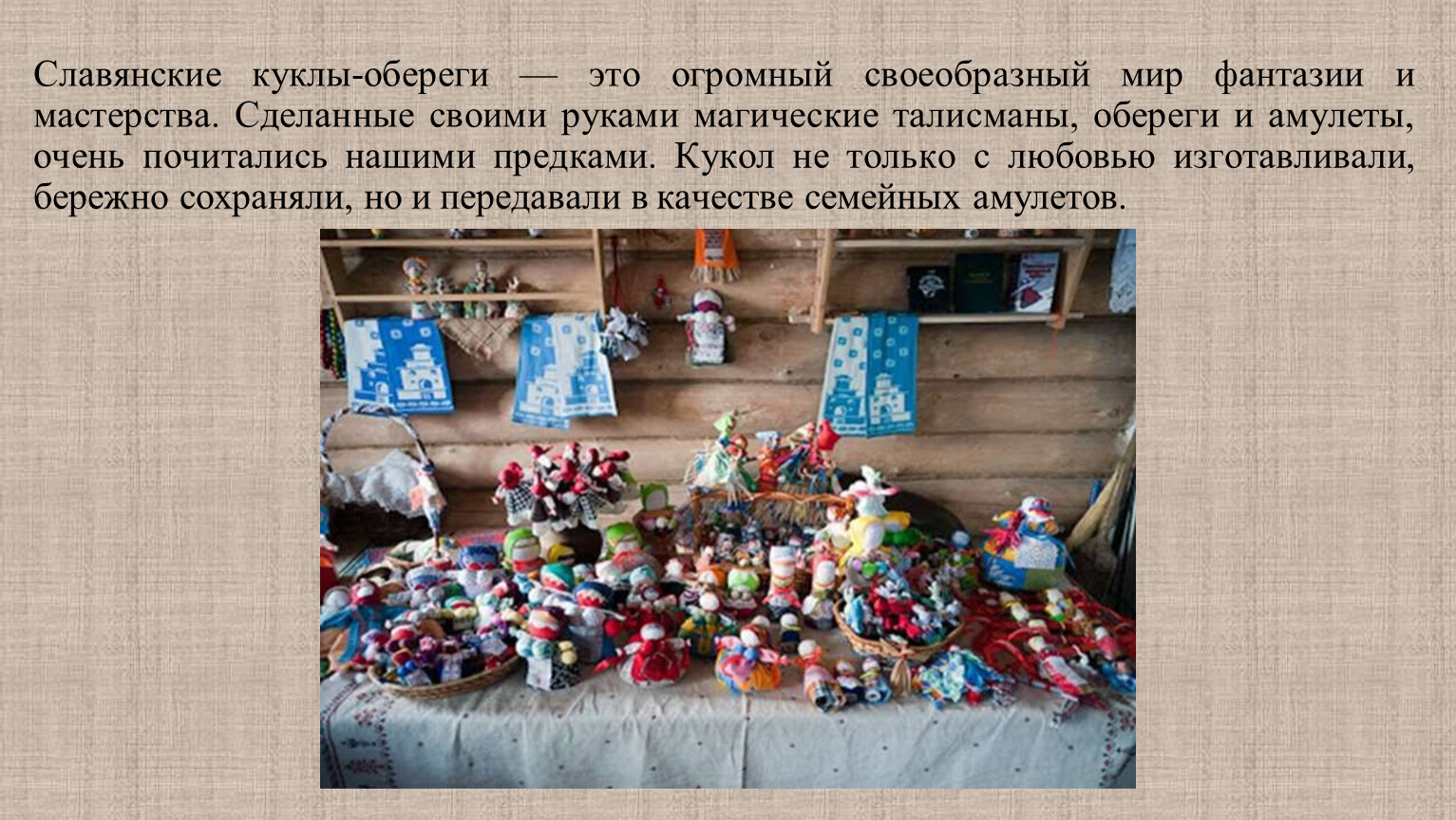 Славянские куклы-обереги — это огромный своеобразный мир фантазии и мастерства. Сделанные своими руками магические талисманы, обереги и амулеты, очень почитались нашими предками. Кукол не только с любовью изготавливали, бережно сохраняли, но и передавали в качестве семейных амулетов.