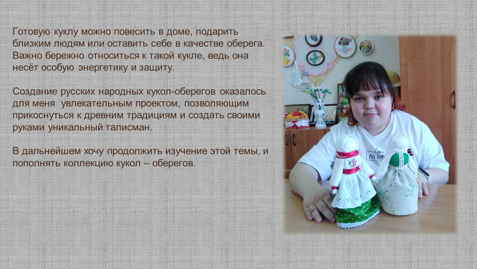 Создание русских народных кукол-оберегов оказалось для меня увлекательным проектом, позволяющим прикоснуться к древним традициям и создать своими руками уникальный талисман.