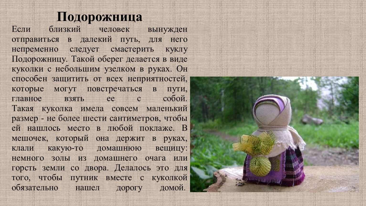 Если близкий человек вынужден отправиться в далекий путь, для него непременно следует смастерить куклу Подорожницу. Такой оберег делается в виде куколки с небольшим узелком в руках. Он способен защитить от всех неприятностей, которые могут повстречаться в пути, главное взять ее с собой. Такая куколка имела совсем маленький размер - не более шести сантиметров, чтобы ей нашлось место в любой поклаже. В мешочек, который она держит в руках, клали какую-то домашнюю вещицу: немного золы из домашнего очага или горсть земли со двора. Делалось это для того, чтобы путник вместе с куколкой обязательно нашел дорогу домой.