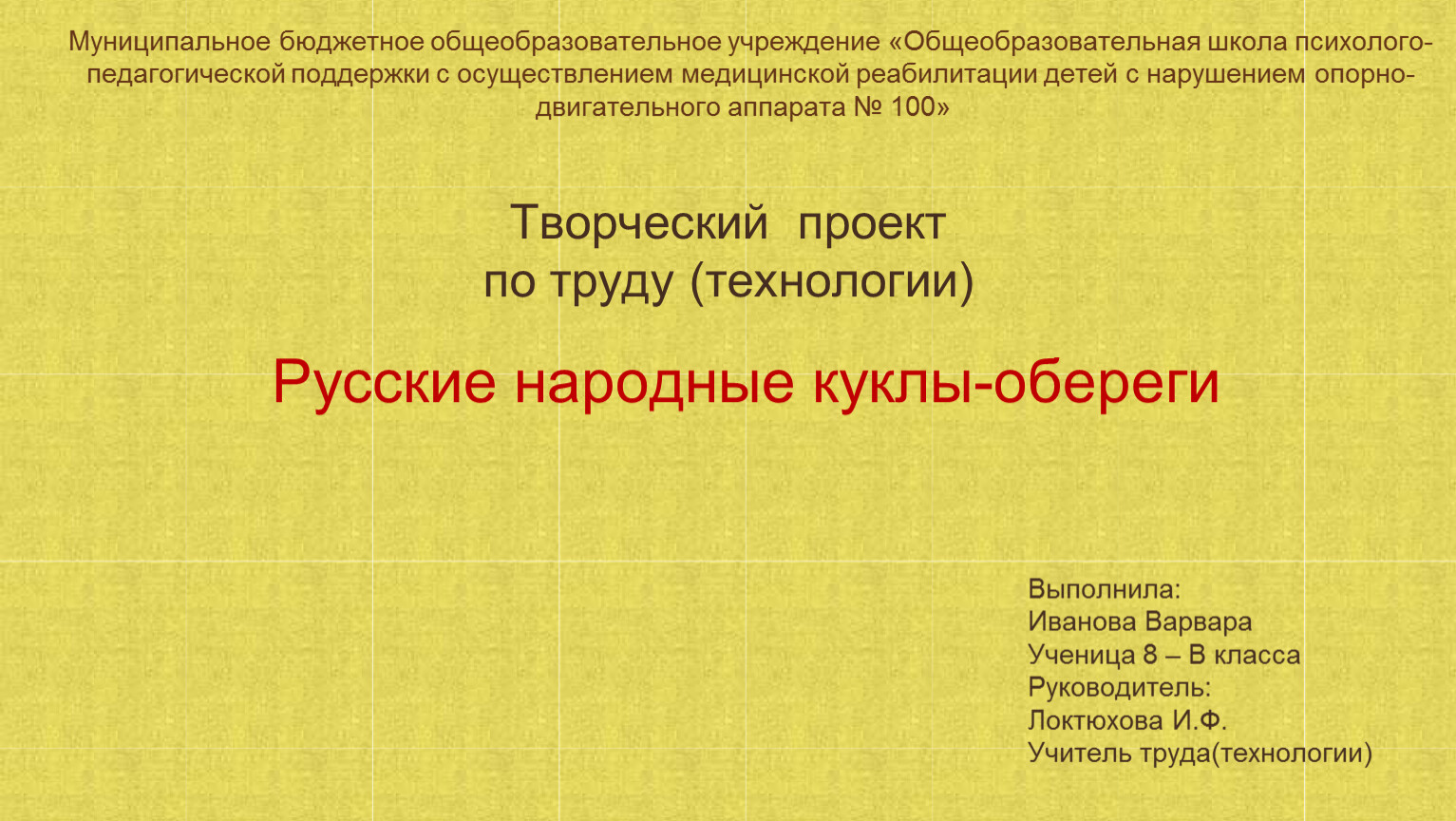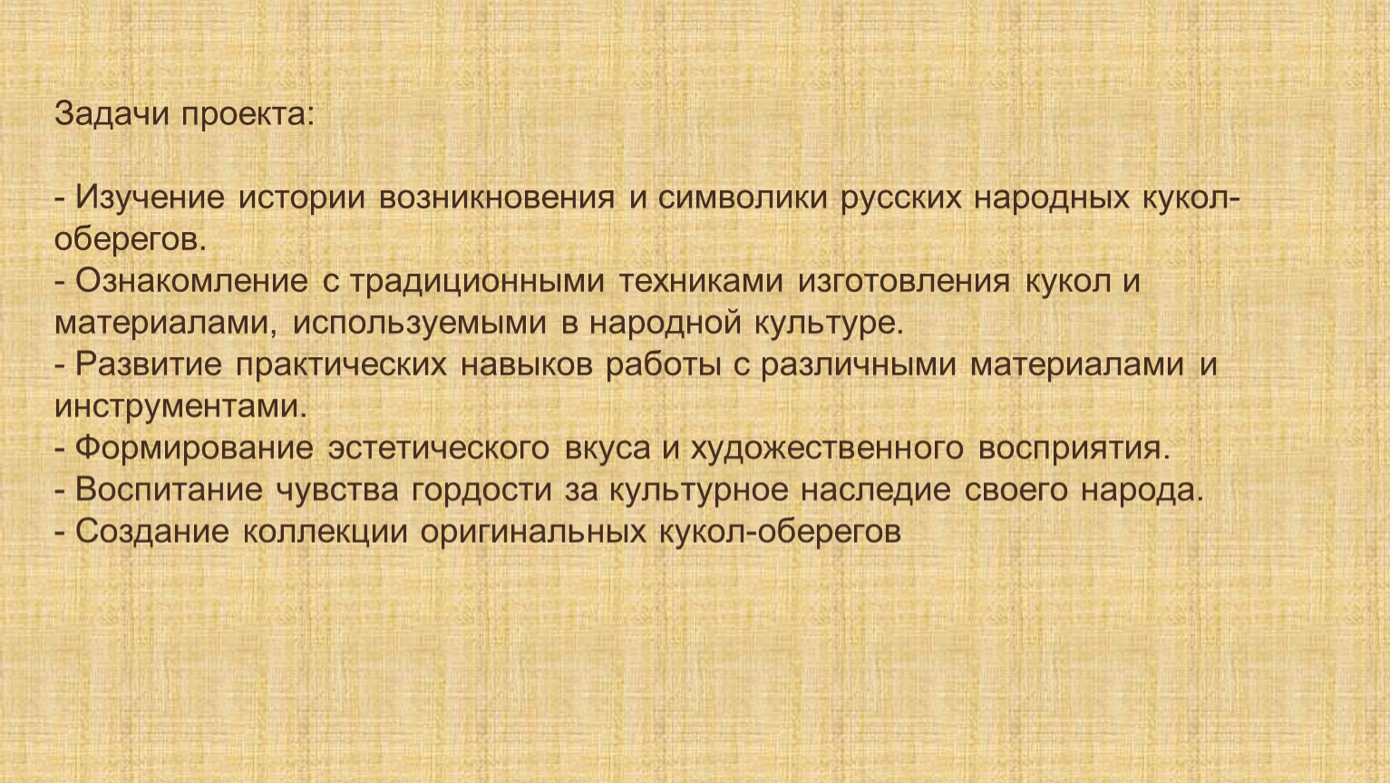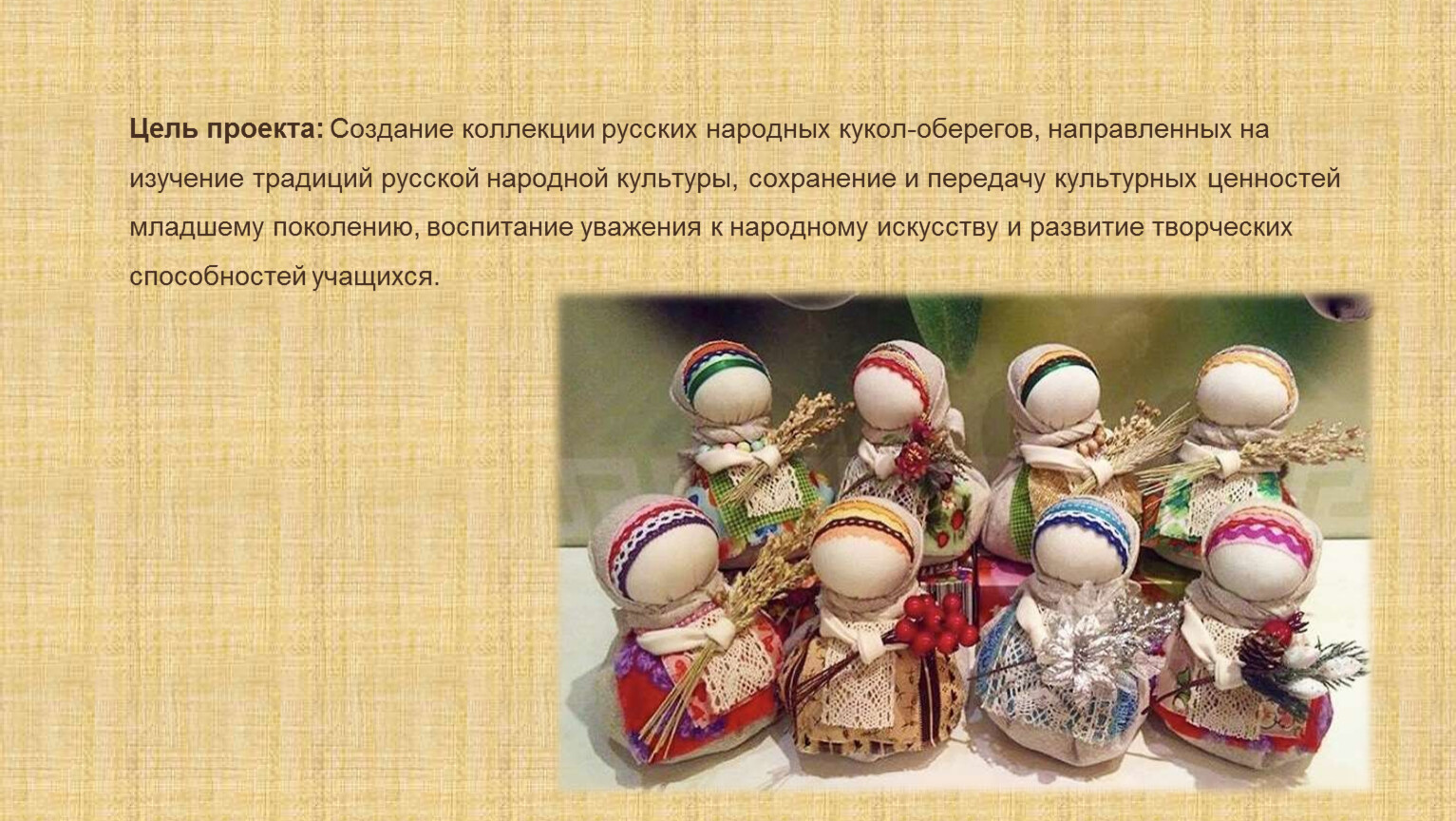 Цель проекта: Создание коллекции русских народных кукол-оберегов, направленных на изучение традиций русской народной культуры, сохранение и передачу культурных ценностей младшему поколению, воспитание уважения к народному искусству и развитие творческих способностей учащихся.