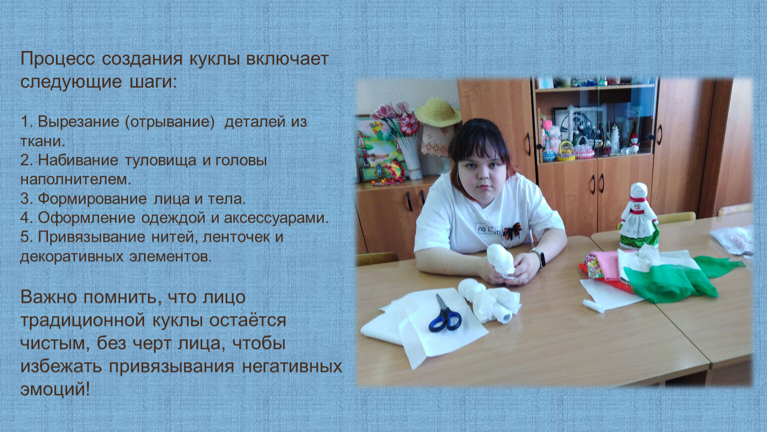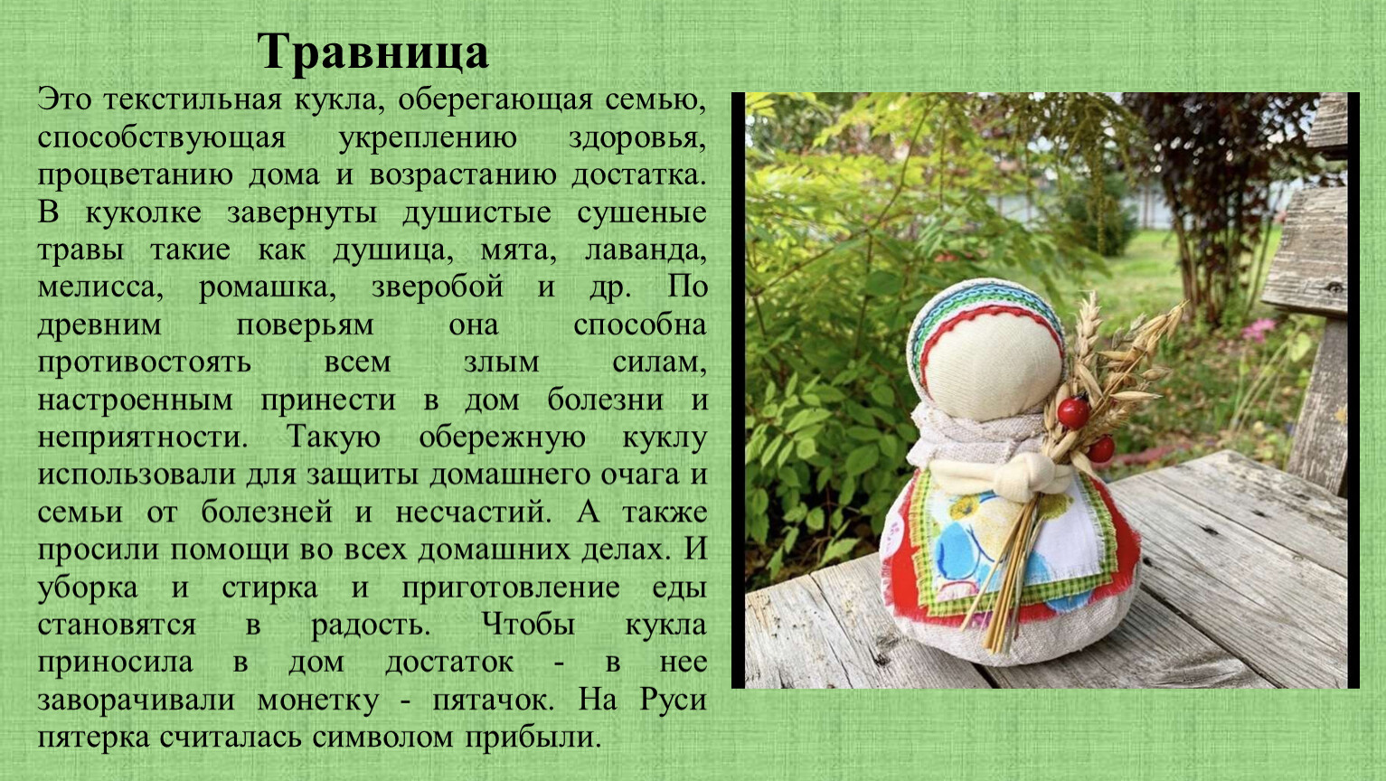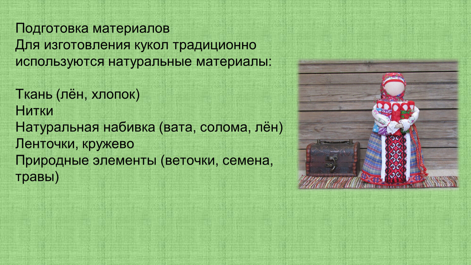 - Ознакомление с традиционными техниками изготовления кукол и материалами, используемыми в народной культуре.