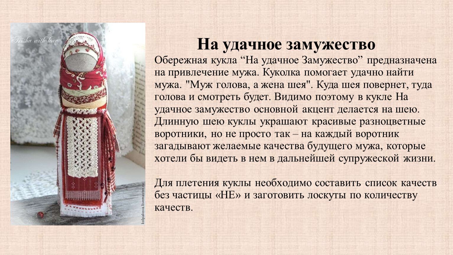 Обережная кукла “На удачное Замужество” предназначена на привлечение мужа. Куколка помогает удачно найти