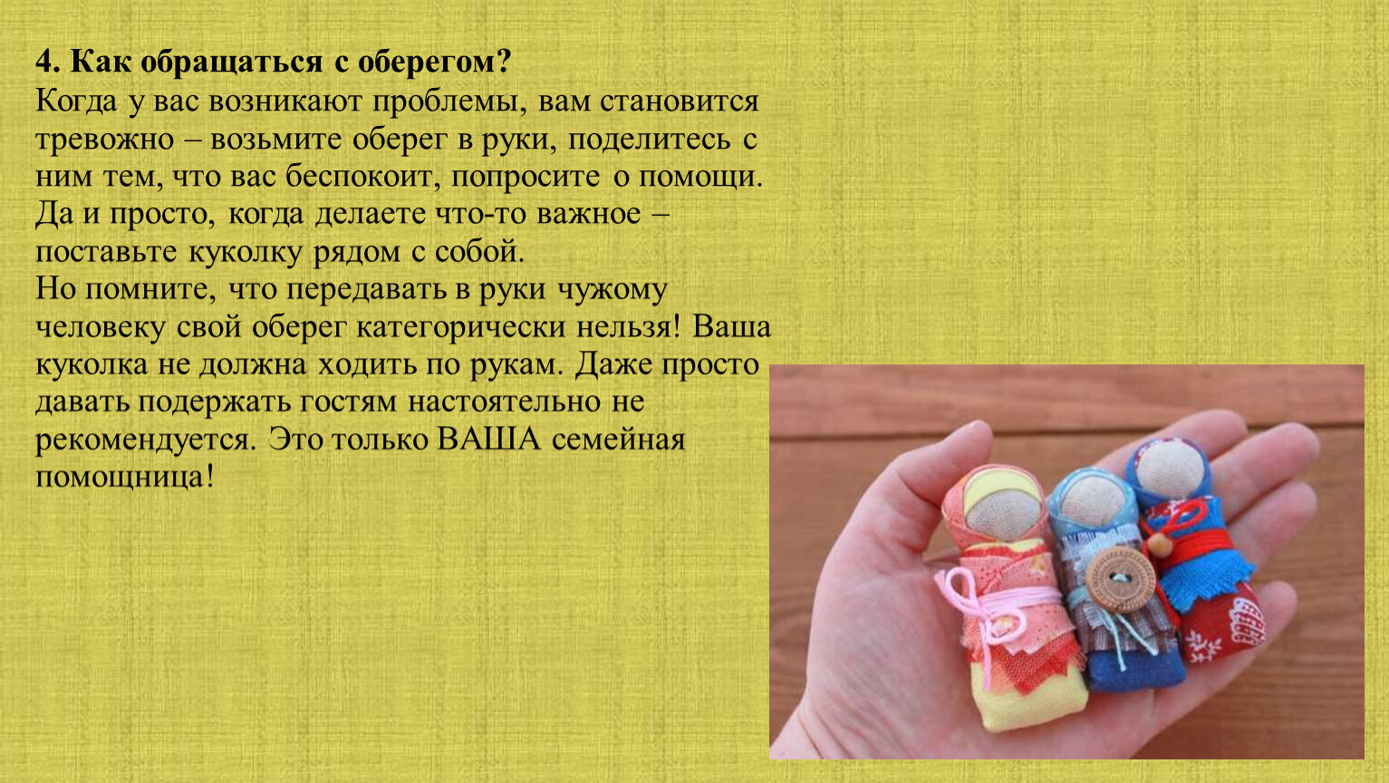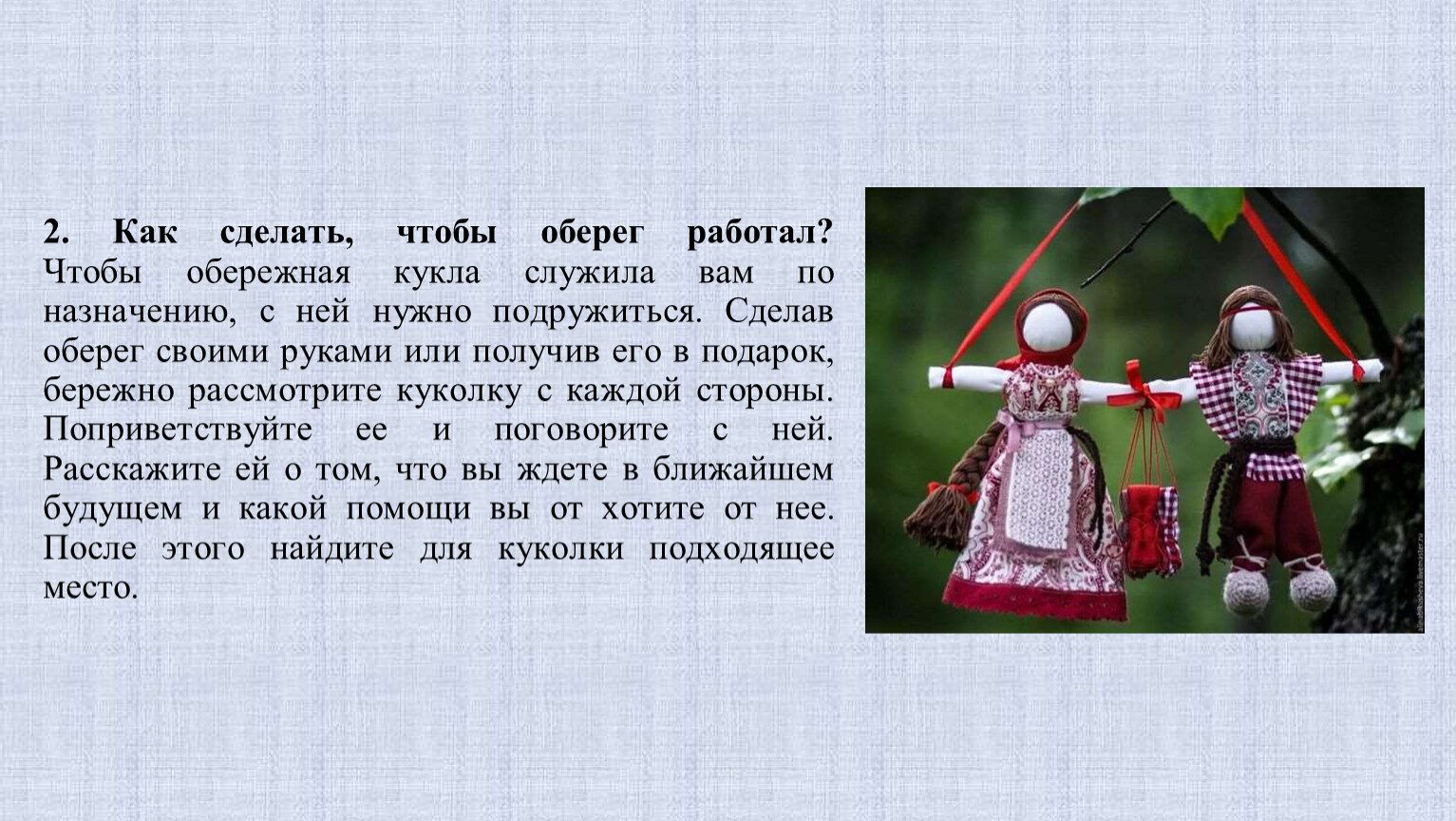 2. Как сделать, чтобы оберег работал? Чтобы обережная кукла служила вам по назначению, с ней нужно подружиться. Сделав оберег своими руками или получив его в подарок, бережно рассмотрите куколку с каждой стороны. Поприветствуйте ее и поговорите с ней. Расскажите ей о том, что вы ждете в ближайшем будущем и какой помощи вы от хотите от нее. После этого найдите для куколки подходящее место.