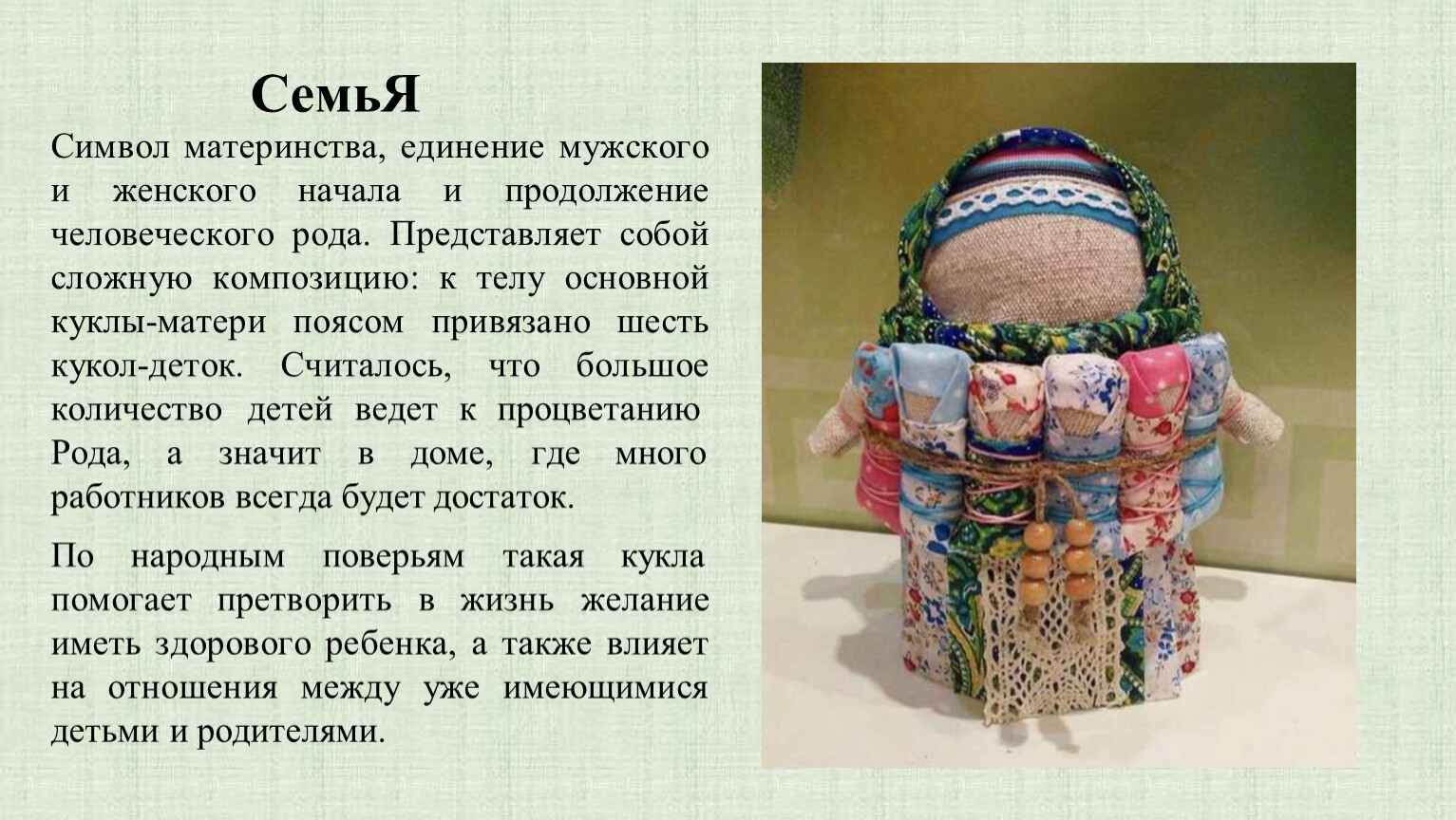 Символ материнства, единение мужского и женского начала и продолжение человеческого рода. Представляет собой сложную композицию: к телу основной куклы-матери поясом привязано шесть кукол-деток. Считалось, что большое количество детей ведет к процветанию