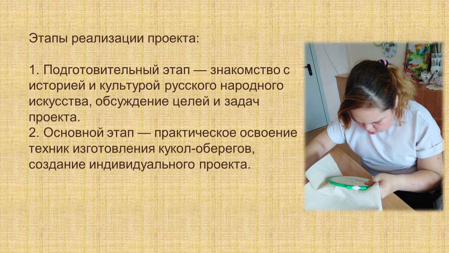 2. Основной этап — практическое освоение техник изготовления кукол-оберегов, создание индивидуального проекта.