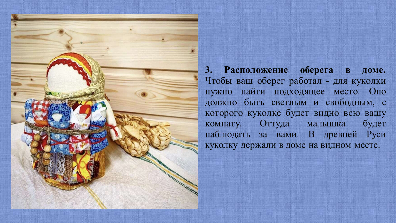 3. Расположение оберега в доме. Чтобы ваш оберег работал - для куколки нужно найти подходящее место. Оно должно быть светлым и свободным, с которого куколке будет видно всю вашу комнату. Оттуда малышка будет наблюдать за вами. В древней Руси куколку держали в доме на видном месте.