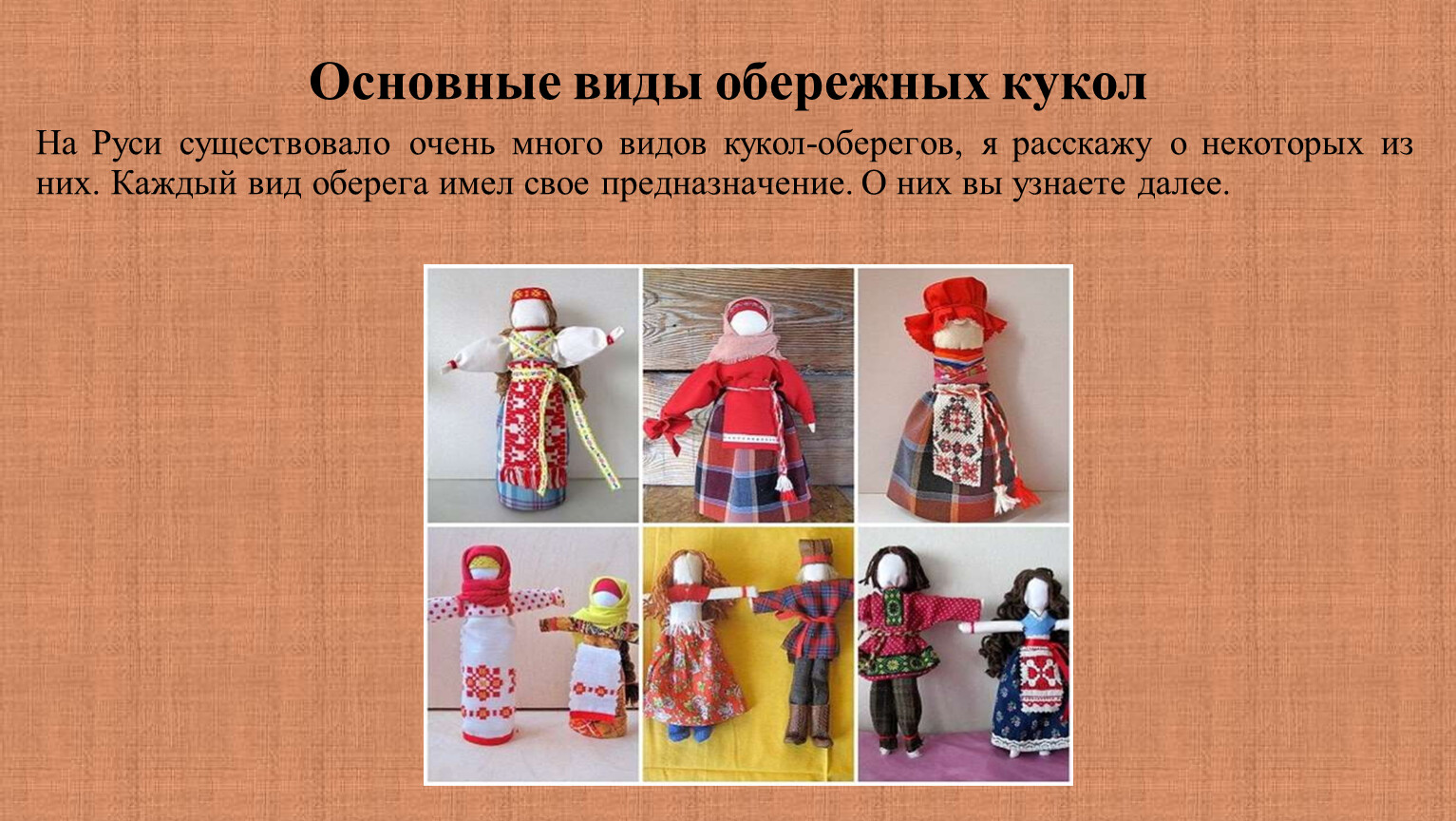 Существует множество видов традиционных русских кукол-оберегов, каждая из которых имеет своё предназначение: