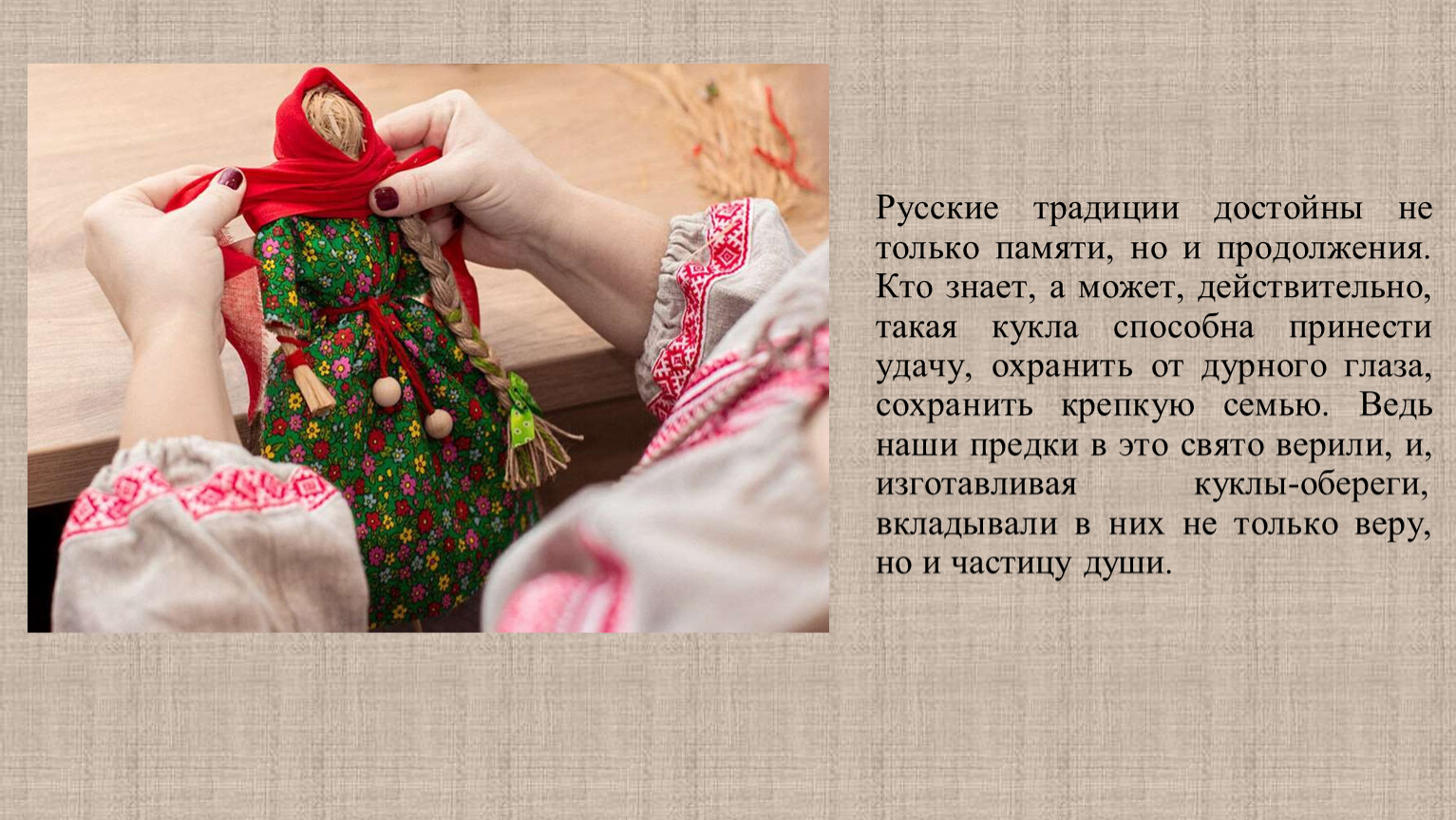 Русские традиции достойны не только памяти, но и продолжения. Кто знает, а может, действительно, такая кукла способна принести удачу, охранить от дурного глаза, сохранить крепкую семью. Ведь наши предки в это свято верили, и, изготавливая куклы-обереги, вкладывали в них не только веру, но и частицу души.
