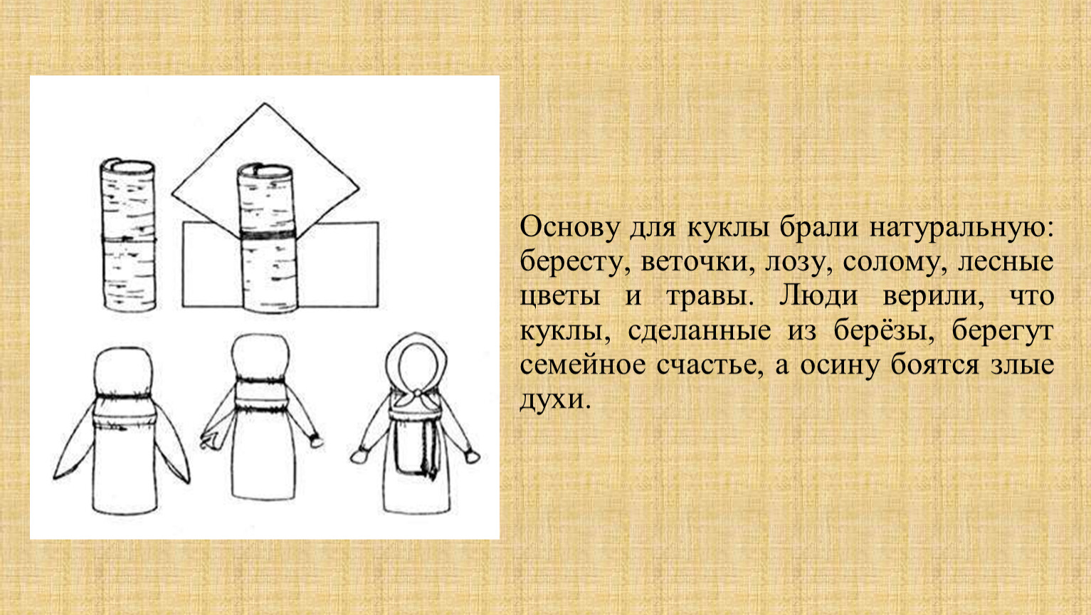 Основу для куклы брали натуральную: бересту, веточки, лозу, солому, лесные цветы и травы. Люди верили, что куклы, сделанные из берёзы, берегут семейное счастье, а осину боятся злые духи.