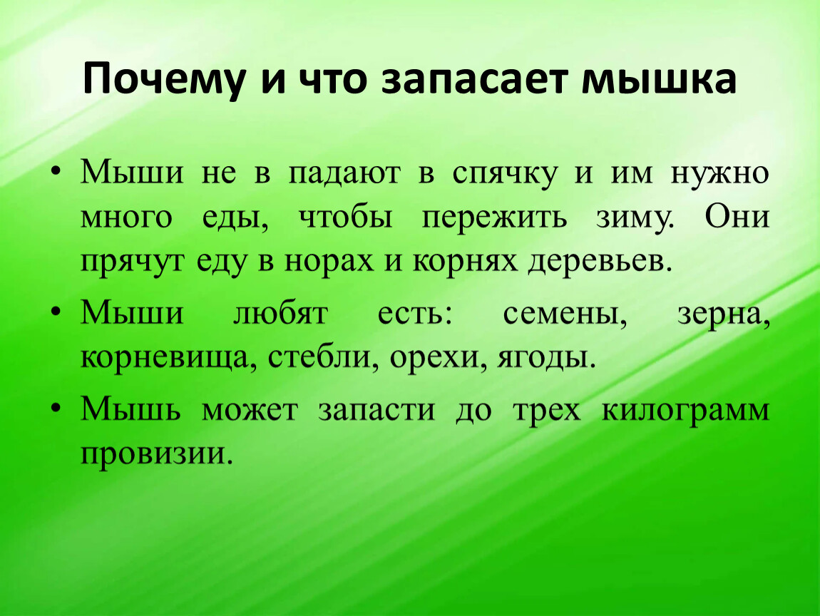 Мыши не в падают в спячку и им нужно много еды, чтобы пережить зиму. Они прячут еду в норах и корнях деревьев.