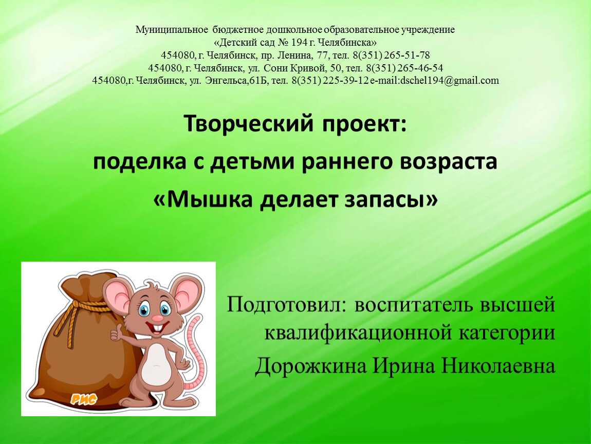 Муниципальное бюджетное дошкольное образовательное учреждение«Детский сад № 194 г. Челябинска»454080, г. Челябинск, пр. Ленина, 77, тел. 8(351) 265-51-78454080, г. Челябинск, ул. Сони Кривой, 50, тел. 8(351) 265-46-54454080,г. Челябинск, ул. Энгельса,61Б, тел. 8(351) 225-39-12 e-mail:dschel194@gmail.com