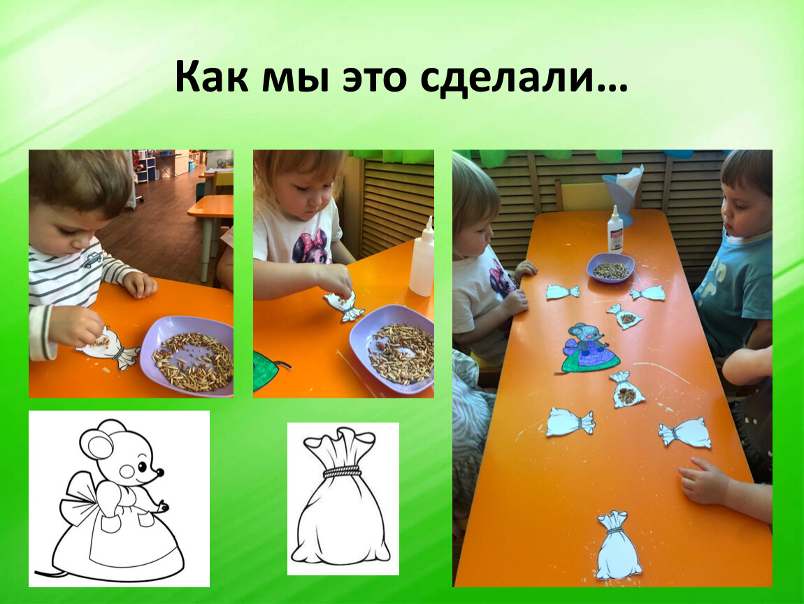 Картон формата, различные зерна, крупы, клей ПВА, картинка мышки и шаблоны мешочков, кисточки для намазывания клея, листочки.