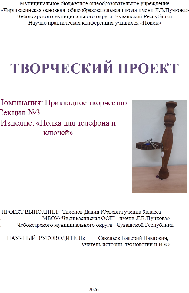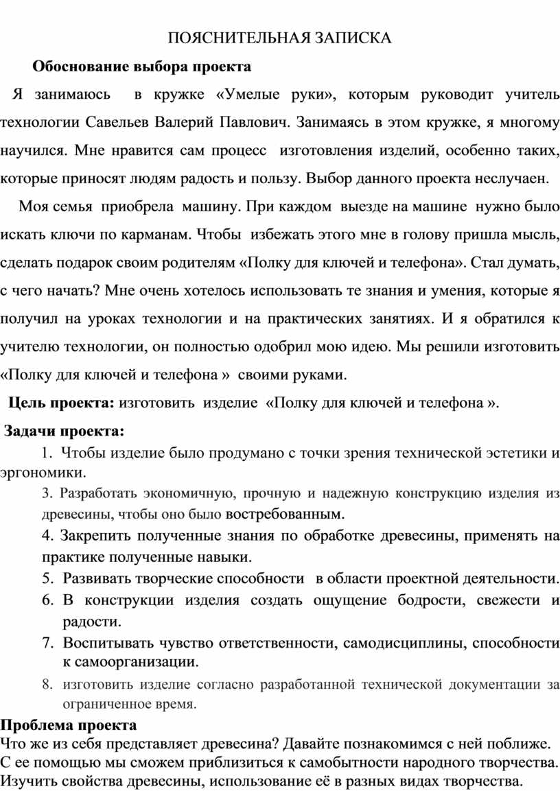 Моя семья приобрела машину. При каждом выезде на машине нужно было искать ключи по карманам. Чтобы избежать этого мне в голову пришла мысль, сделать подарок своим родителям «Полку для ключей и телефона». Стал думать, с чего начать? Мне очень хотелось использовать те знания и умения, которые я получил на уроках технологии и на практических занятиях. И я обратился к учителю технологии, он полностью одобрил мою идею. Мы решили изготовить «Полку для ключей и телефона » своими руками.