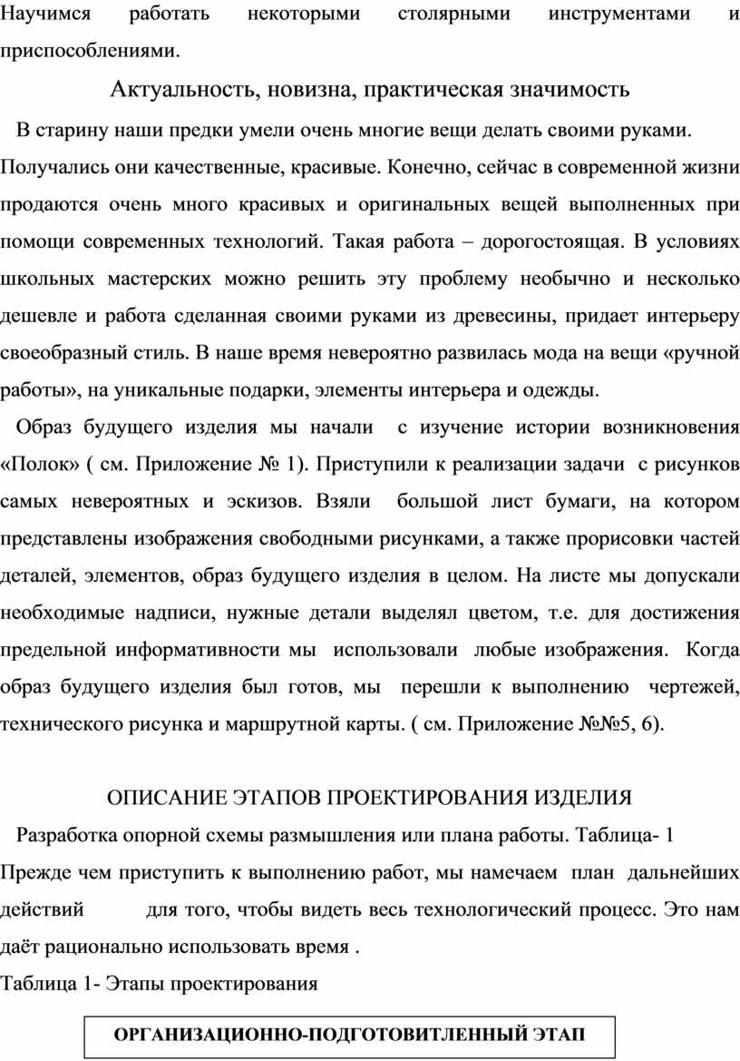 Образ будущего изделия мы начали с изучение истории возникновения «Полок» ( см. Приложение № 1). Приступили к реализации задачи с рисунков самых невероятных и эскизов. Взяли большой лист бумаги, на котором представлены изображения свободными рисунками, а также прорисовки частей деталей, элементов, образ будущего изделия в целом. На листе мы допускали необходимые надписи, нужные детали выделял цветом, т.е. для достижения предельной информативности мы использовали любые изображения. Когда образ будущего изделия был готов, мы перешли к выполнению чертежей, технического рисунка и маршрутной карты. ( см. Приложение №№5, 6).