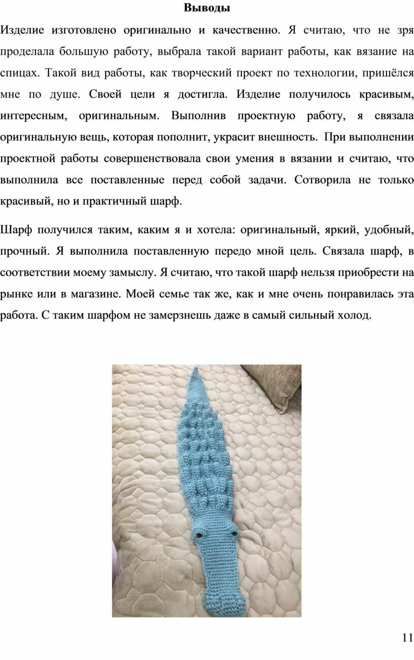 Изделие изготовлено оригинально и качественно. Я считаю, что не зря проделала большую работу, выбрала такой вариант работы, как вязание на спицах. Такой вид работы, как творческий проект по технологии, пришёлся мне по душе. Своей цели я достигла. Изделие получилось красивым, интересным, оригинальным. Выполнив проектную работу, я связала оригинальную вещь, которая пополнит, украсит внешность. При выполнении проектной работы совершенствовала свои умения в вязании и считаю, что выполнила все поставленные перед собой задачи. Сотворила не только красивый, но и практичный шарф.