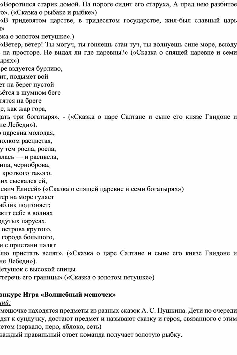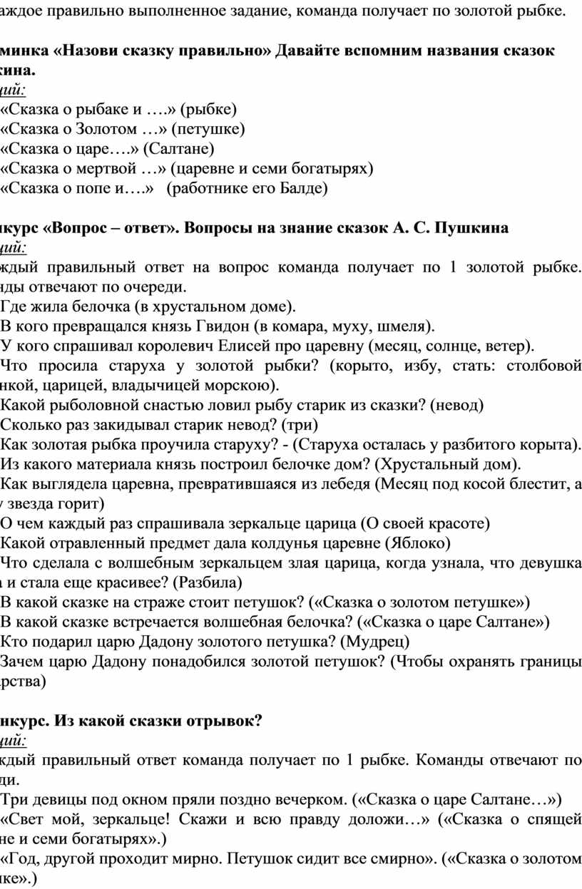 I. Конкурс «Вопрос – ответ». Вопросы на знание сказок А. С. Пушкина