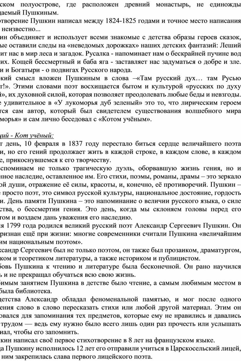 Стихотворение «У лукоморья» не только дарит радость детям своим волшебством, но и обогащает взрослых глубокими размышлениями о творчестве, воображении и культурном наследии. День памяти А.С. Пушкина позволяет нам вновь окунуться в мир, созданный великим русским поэтом, и почувствовать всю красоту и глубину его таланта.