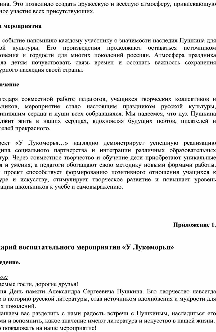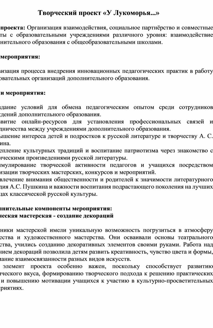 Проект «У Лукоморья…» наглядно демонстрирует успешную реализацию принципа социального партнерства и интеграции различных образовательных структур. Через совместное творчество и обучение дети приобретают уникальные знания и умения, а педагоги обогащают свою методику новыми формами работы. Такой проект способствует формированию позитивного отношения учащихся к культуре и искусству, стимулирует творческое развитие и повышает уровень мотивации школьников к учебе и самовыражению.