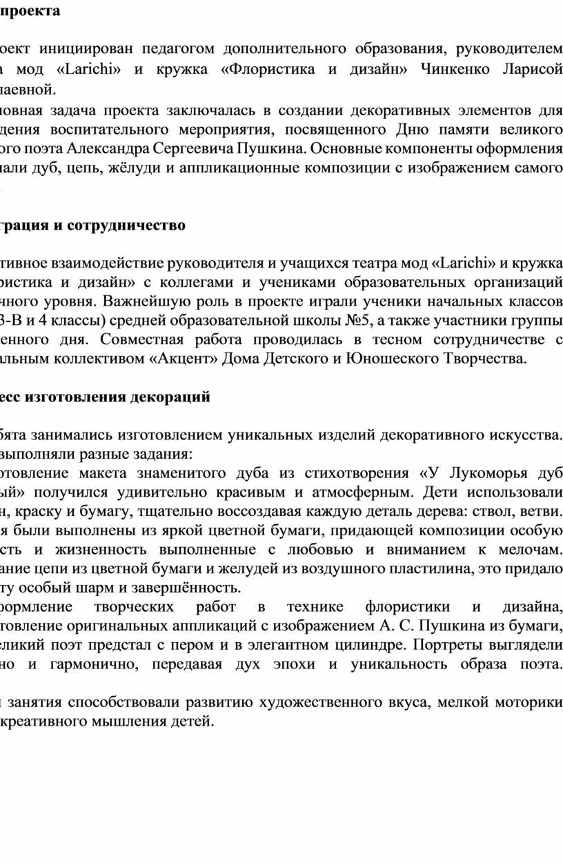 Основная задача проекта заключалась в создании декоративных элементов для проведения воспитательного мероприятия, посвященного Дню памяти великого русского поэта Александра Сергеевича Пушкина. Основные компоненты оформления включали дуб, цепь, жёлуди и аппликационные композиции с изображением самого поэта.