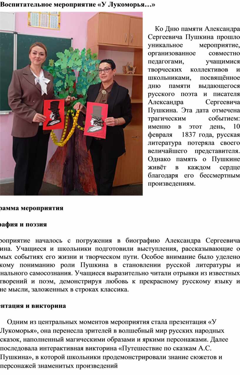 Одним из центральных моментов мероприятия стала презентация «У Лукоморья», она перенесла зрителей в волшебный мир русских народных сказок, наполненный магическими образами и яркими персонажами. Далее последовала интерактивная викторина «Путешествие по сказкам А.С. Пушкина», в которой школьники продемонстрировали знание сюжетов и персонажей знаменитых произведений Пушкина. Это позволило создать дружескую и весёлую атмосферу, привлекающую активное участие всех присутствующих.
