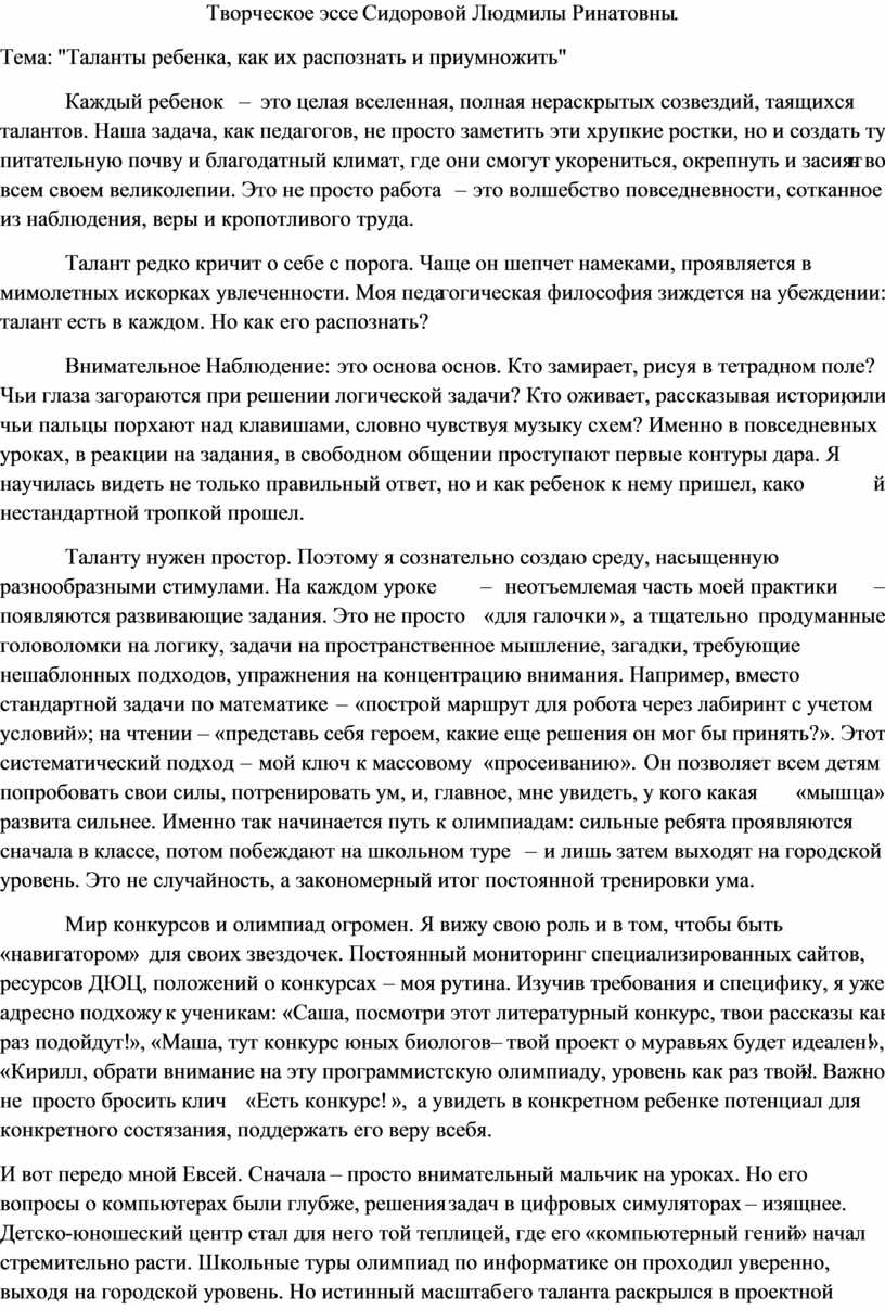 Творческое эссе Сидоровой Людмилы Ринатовны.