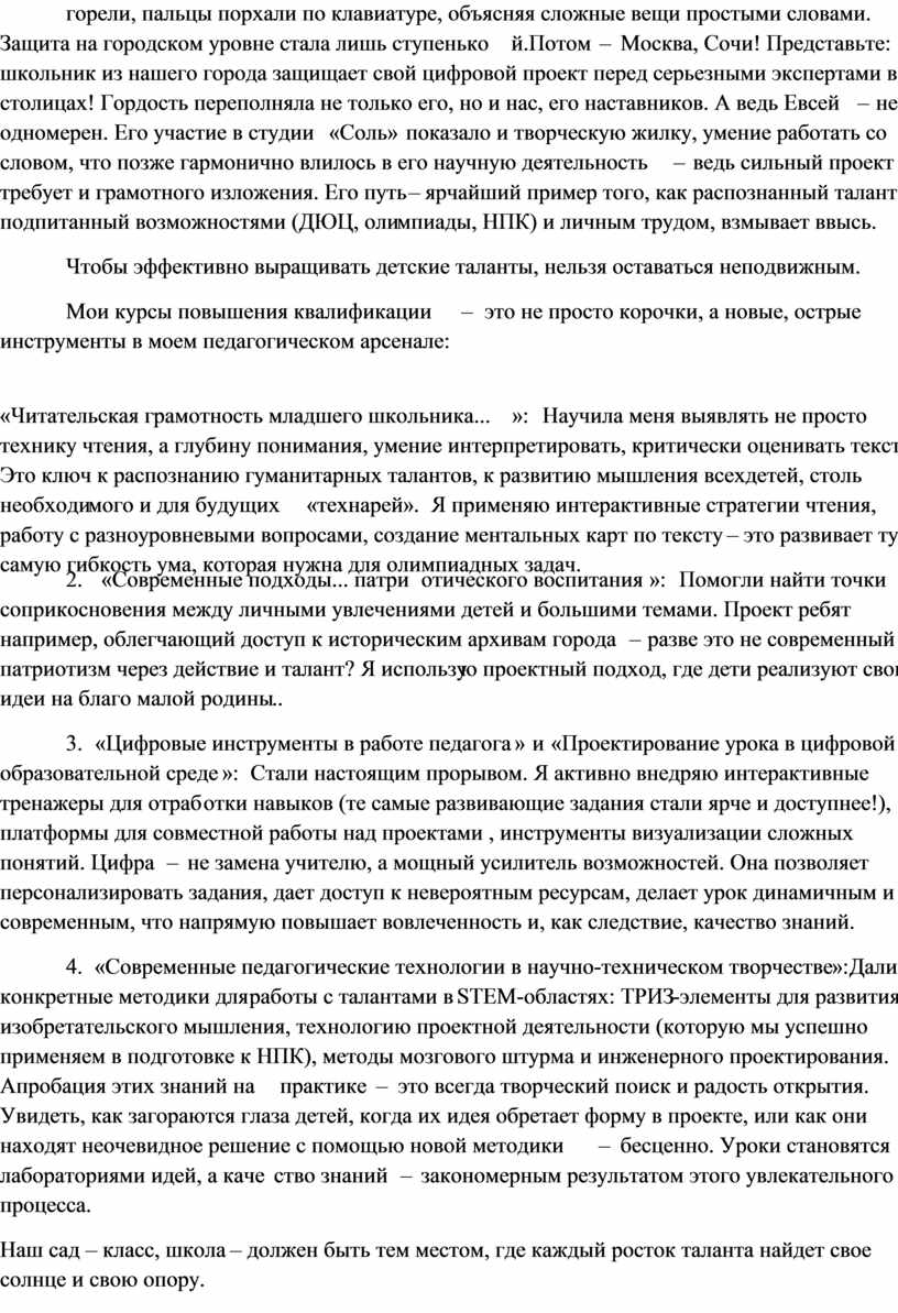 1. «Читательская грамотность младшего школьника...»: Научила меня выявлять не просто технику чтения, а глубину понимания, умение интерпретировать, критически оценивать текст. Это ключ к распознанию гуманитарных талантов, к развитию мышления всехдетей, столь необходимого и для будущих «технарей». Я применяю интерактивные стратегии чтения, работу с разноуровневыми вопросами, создание ментальных карт по тексту – это развивает ту самую гибкость ума, которая нужна для олимпиадных задач.
