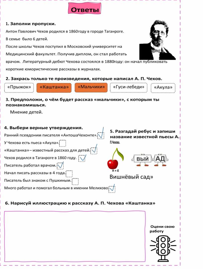 5. Разгадай ребус и запиши Ранний псевдоним писателя «Антоша Чехонте». название известной пьесы А.