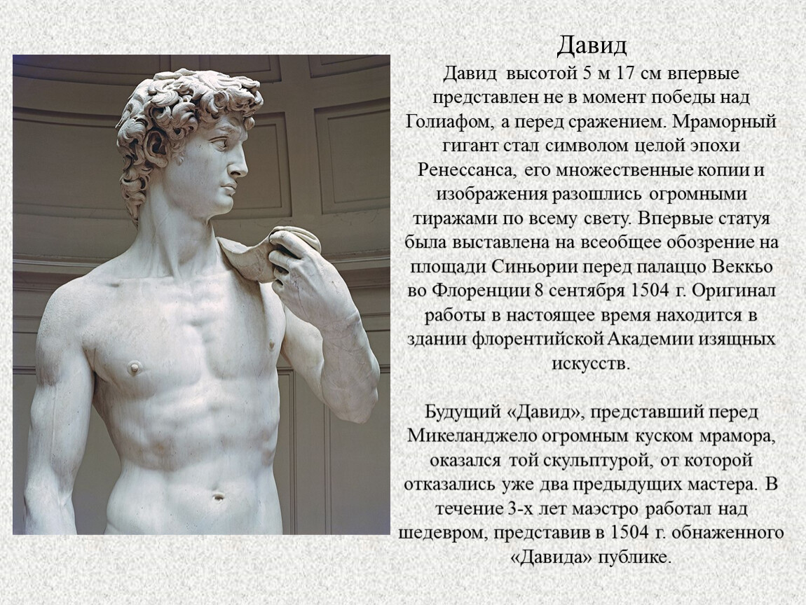 Давид высотой 5 м 17 см впервые представлен не в момент победы над Голиафом, а перед сражением. Мраморный гигант стал символом целой эпохи Ренессанса, его множественные копии и изображения разошлись огромными тиражами по всему свету. Впервые статуя была выставлена на всеобщее обозрение на площади Синьории перед палаццо Веккьо во Флоренции 8 сентября 1504 г. Оригинал работы в настоящее время находится в здании флорентийской Aкадемии изящных искусств.