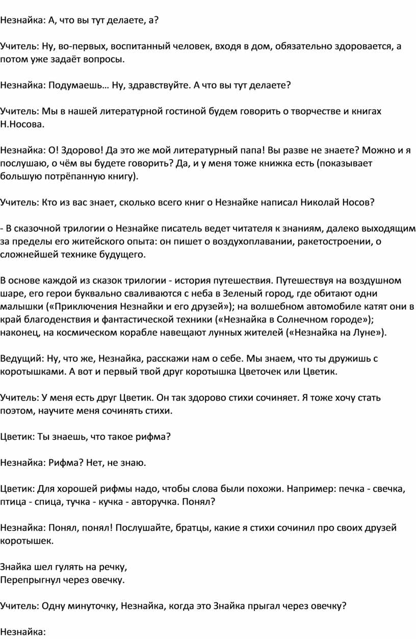 Учитель: Мы в нашей литературной гостиной будем говорить о творчестве и книгах Н.Носова.