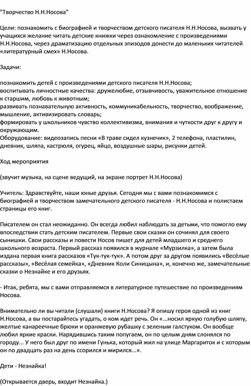 Цели: познакомить с биографией и творчеством детского писателя Н.Н.Носова, вызвать у учащихся желание читать детские книжки через ознакомление с произведениями Н.Н.Носова, через драматизацию отдельных эпизодов донести до маленьких читателей «литературный смех» Н.Носова.