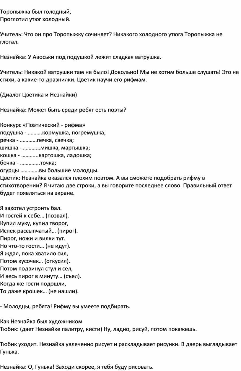 Цветик: Незнайка оказался плохим поэтом. А вы сможете подобрать рифму в стихотворении? Я читаю две строки, а вы говорите последнее слово. Правильный ответ будет появляться на экране.